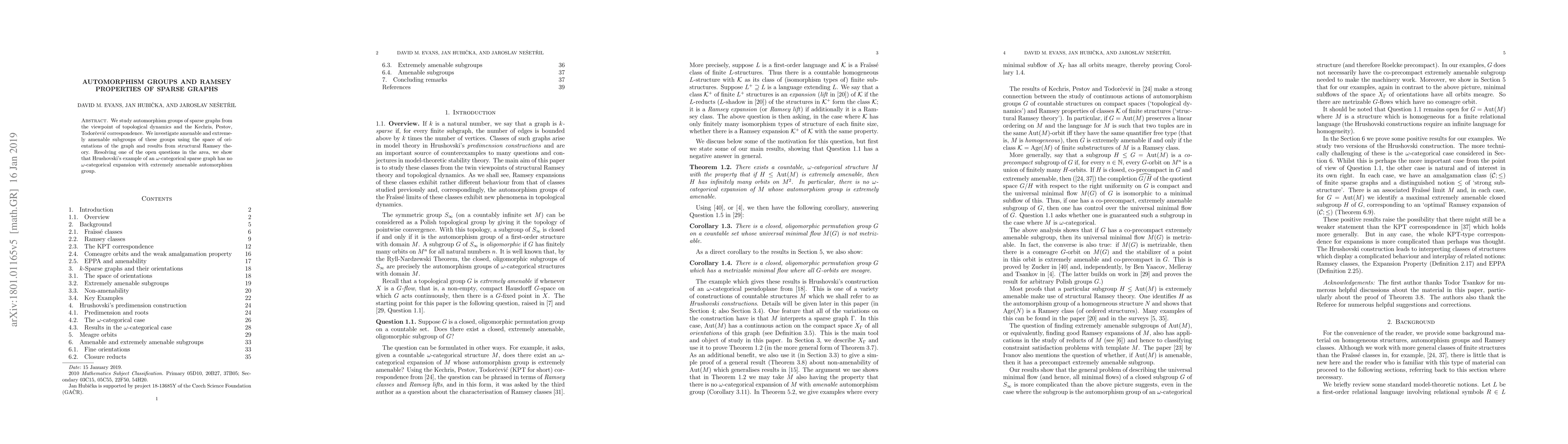 This paper examines automorphism groups of sparse graphs through topological dynamics and Ramsey theory, focusing on amenable and extremely amenable subgroups. It resolves an open question by demonstrating that Hrushovski's example of an ω-categorical sparse graph lacks an ω-categorical expansion with an extremely amenable automorphism group.