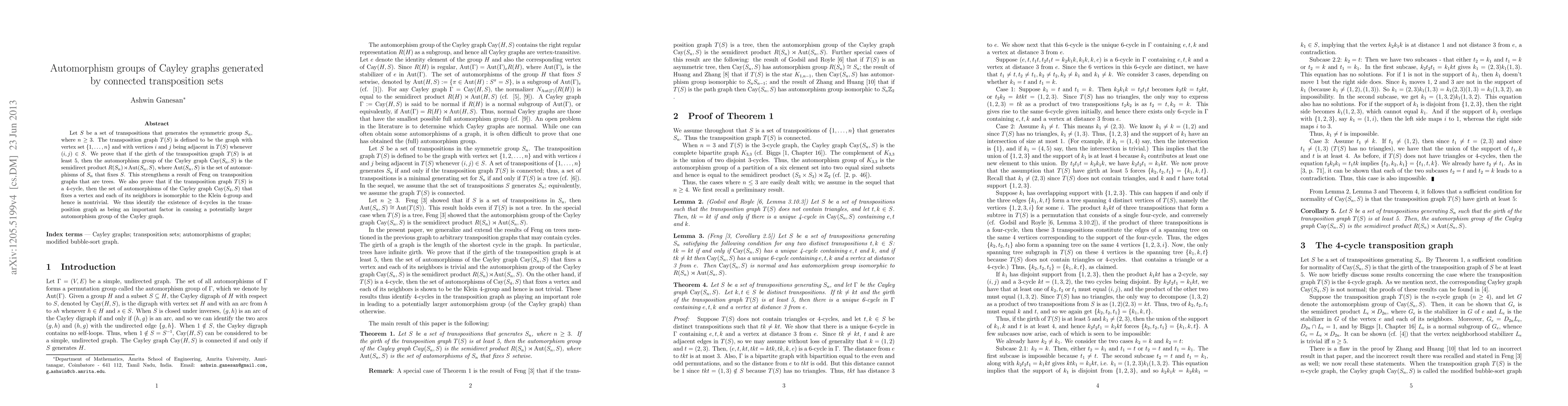 Let $S$ be a set of transpositions that generates the symmetric group $S_n$, where $n \ge 3$. The transposition graph $T(S)$ is defined to be the graph with vertex set $\{1,\ldots,n\}$ and with vertices $i$ and $j$ being adjacent in $T(S)$ whenever $(i,j) \in S$. We prove that if the girth of the transposition graph $T(S)$ is at least 5, then the automorphism group of the Cayley graph $\Cay(S_n,S)$ is the semidirect product $R(S_n) \rtimes \Aut(S_n,S)$, where $\Aut(S_n,S)$ is the set of automorphisms of $S_n$ that fixes $S$. This strengthens a result of Feng on transposition graphs that are trees. We also prove that if the transposition graph $T(S)$ is a 4-cycle, then the set of automorphisms of the Cayley graph $\Cay(S_4,S)$ that fixes a vertex and each of its neighbors is isomorphic to the Klein 4-group and hence is nontrivial. We thus identify the existence of 4-cycles in the transposition graph as being an important factor in causing a potentially larger automorphism group of the Cayley graph.