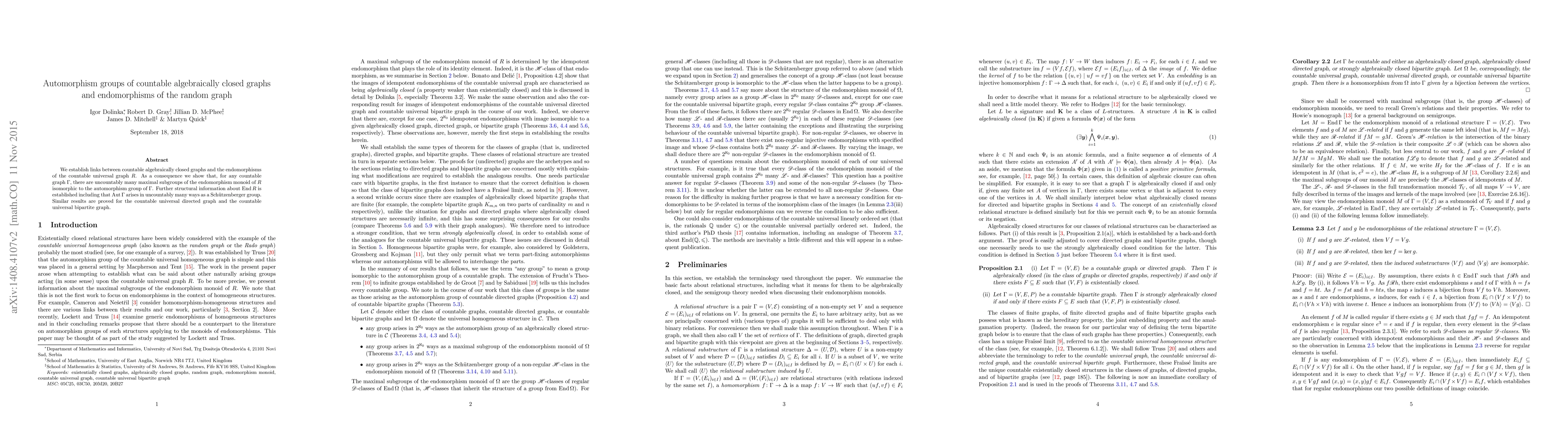 We establish links between countable algebraically closed graphs and the endomorphisms of the countable universal graph $R$. As a consequence we show that, for any countable graph $\Gamma$, there are uncountably many maximal subgroups of the endomorphism monoid of $R$ isomorphic to the automorphism group of $\Gamma$. Further structural information about End $R$ is established including that Aut $\Gamma$ arises in uncountably many ways as a Sch\"{u}tzenberger group. Similar results are proved for the countable universal directed graph and the countable universal bipartite graph.