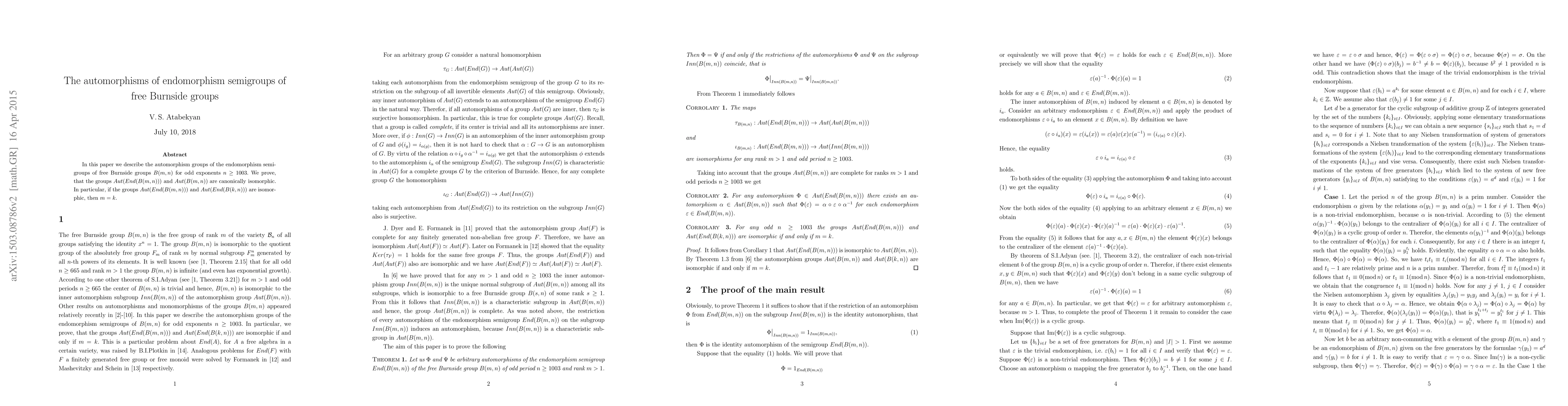 In this paper we describe the automorphism groups of the endomorphism semigroups of free Burnside groups $B(m,n)$ for odd exponents $n\ge1003$. We prove, that the groups $Aut(End(B(m,n)))$ and $Aut(B(m,n))$ are isomorphic. In particular, if the groups $Aut(End(B(m,n)))$ and $Aut(End(B(k,n)))$ are isomorphic, then $m=k$.