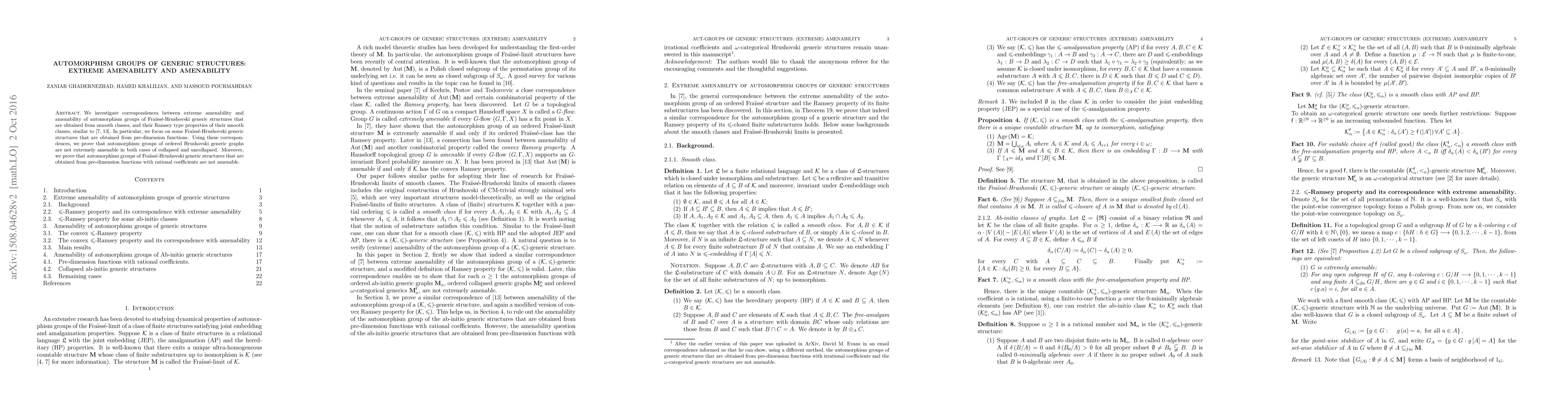 Summary: This paper examines the relationship between extreme amenability and amenability in automorphism groups of generic Fraissé-Hrushovski structures derived from smooth classes. It concludes that automorphism groups of ordered Hrushovski generic graphs are neither extremely amenable nor amenable, particularly when derived from pre-dimension functions with rational coefficients.