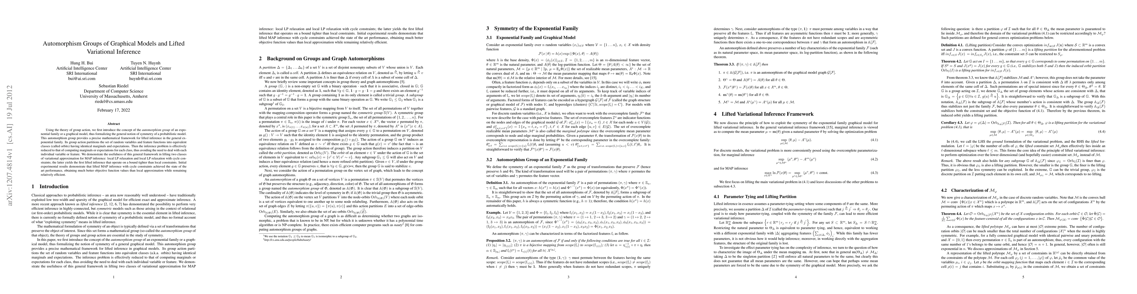 This paper introduces the concept of automorphism groups in graphical models to formalize symmetry in probabilistic models, enabling lifted variational inference. It demonstrates how this framework simplifies inference by computing marginals for equivalent classes, achieving state-of-the-art performance in lifted MAP inference with cycle constraints.