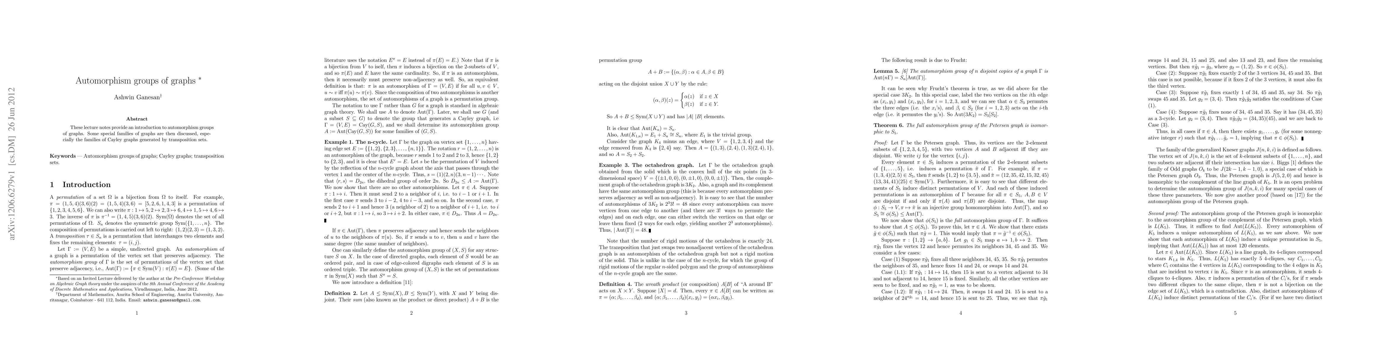 The paper provides an introduction to automorphism groups of graphs, with a focus on special families such as Cayley graphs generated by transposition sets.