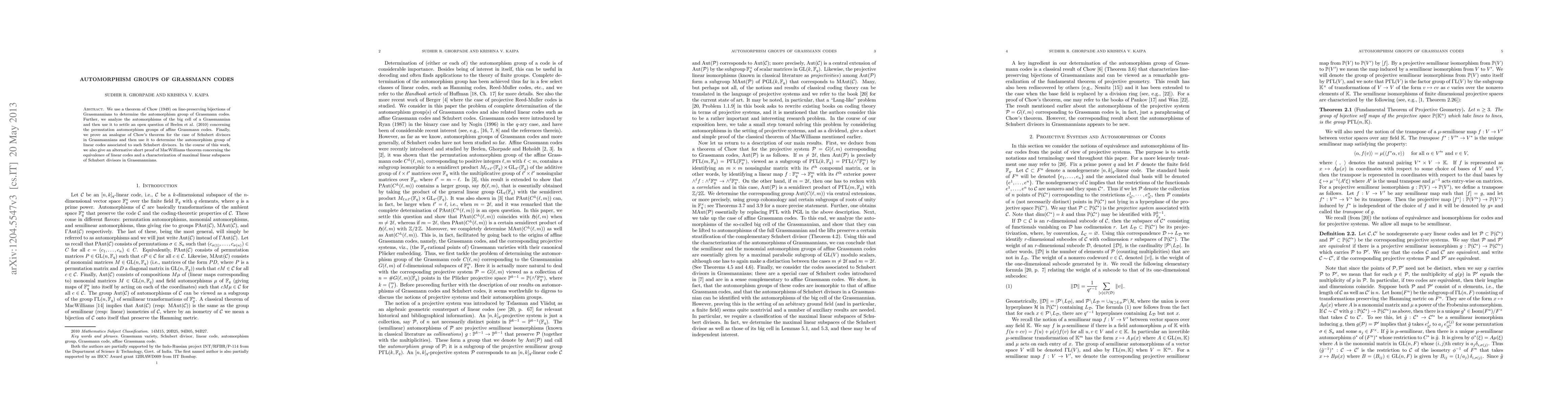 This paper determines the automorphism group of Grassmann codes using Chow's theorem on line-preserving bijections. It also resolves an open question regarding permutation automorphism groups of affine Grassmann codes and extends Chow's theorem to Schubert divisors, providing insights into associated linear codes.