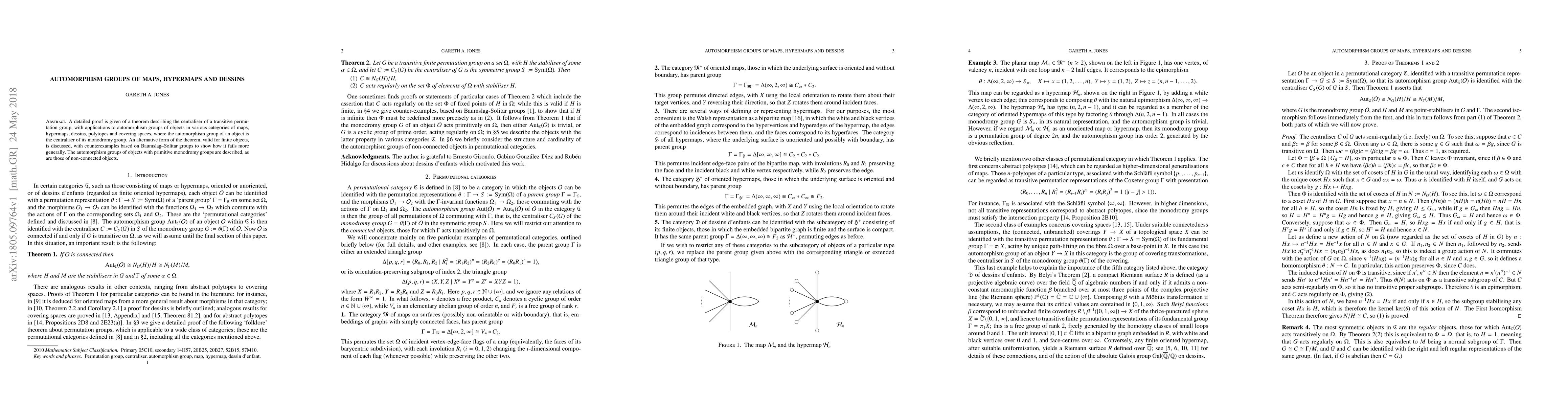 This paper proves a theorem on the centralizer of a transitive permutation group, applying it to automorphism groups in various categories like maps, hypermaps, and dessins, where the automorphism group is the centralizer of the object's monodromy group. It also discusses an alternative form for finite objects and provides counterexamples showing its limitations.