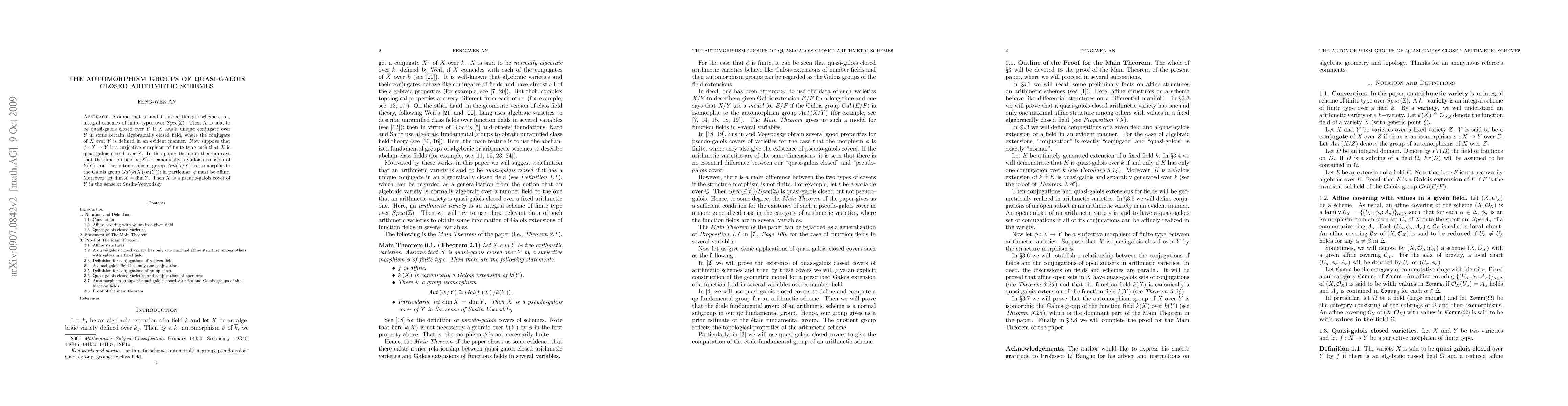 Assume that $X$ and $Y$ are arithmetic schemes, i.e., integral schemes of finite types over $Spec(\mathbb{Z})$. Then $X$ is said to be quasi-galois closed over $Y$ if $X$ has a unique conjugate over $Y$ in some certain algebraically closed field, where the conjugate of $X$ over $Y$ is defined in an evident manner. Now suppose that $\phi:X\to Y$ is a surjective morphism of finite type such that $X$ is quasi-galois closed over $Y$. In this paper the main theorem says that the function field $ k(X)$ is canonically a Galois extension of $k(Y)$ and the automorphism group ${Aut}(X/Y)$ is isomorphic to the Galois group $Gal(k(X)/k(Y))$; in particular, $\phi$ must be affine. Moreover, let $\dim X=\dim Y$. Then $X$ is a pseudo-galois cover of $Y$ in the sense of Suslin-Voevodsky.