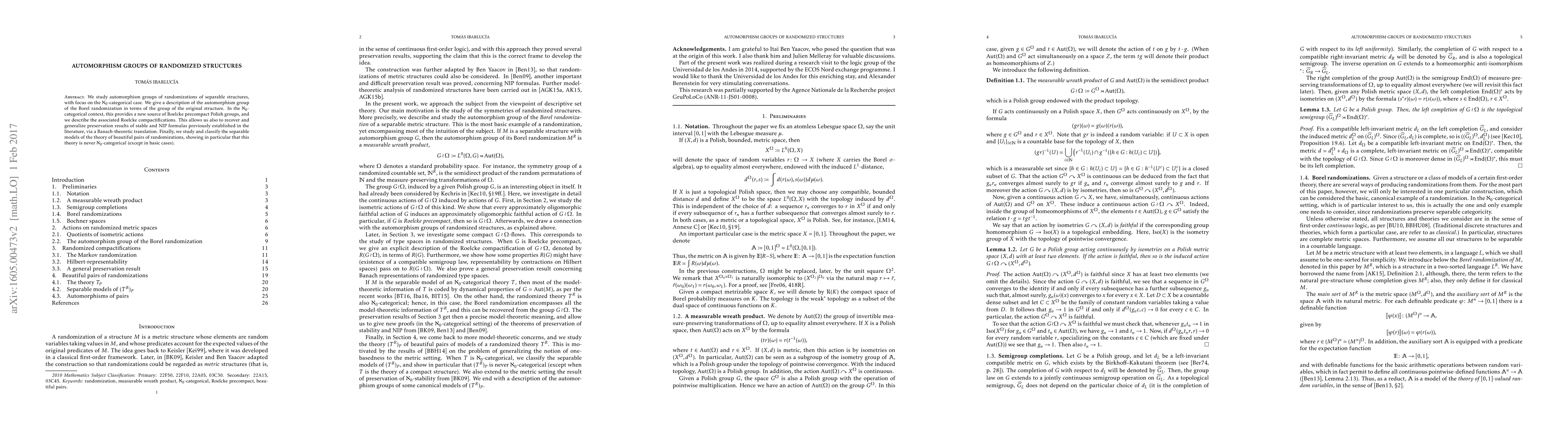 We study automorphism groups of randomizations of separable structures, with focus on the $\aleph_0$-categorical case. We give a description of the automorphism group of the Borel randomization in terms of the group of the original structure. In the $\aleph_0$-categorical context, this provides a new source of Roelcke precompact Polish groups, and we describe the associated Roelcke compactifications. This allows us also to recover and generalize preservation results of stable and NIP formulas previously established in the literature, via a Banach-theoretic translation. Finally, we study and classify the separable models of the theory of beautiful pairs of randomizations, showing in particular that this theory is never $\aleph_0$-categorical (except in basic cases).