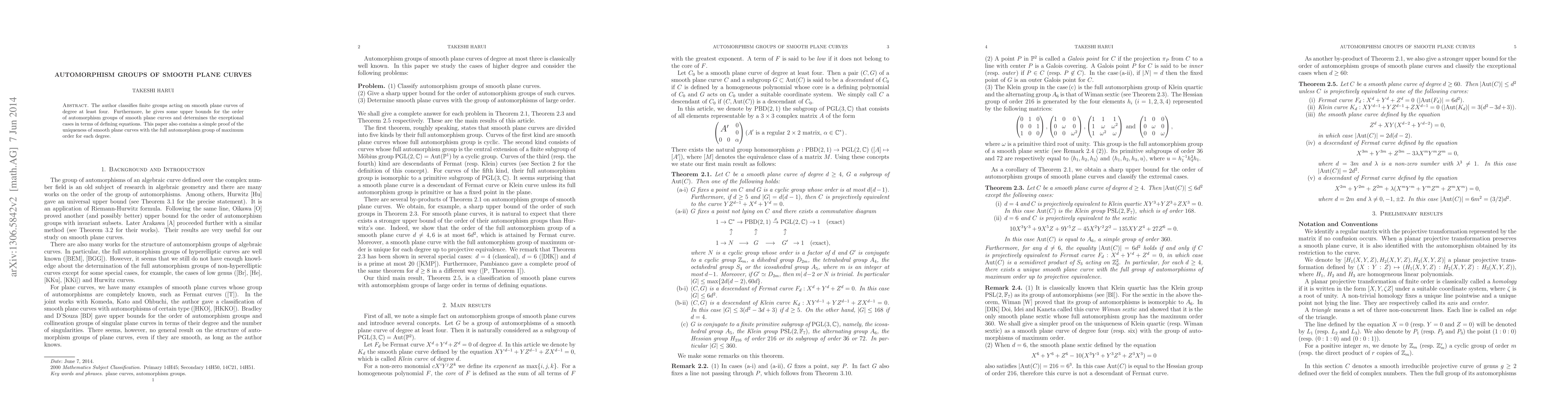 This paper investigates the structure and size of automorphism groups for smooth plane curves of degree four or higher, providing upper bounds for their orders and classifying those with large automorphism groups, while also proving the uniqueness of curves with maximal automorphism group size for each degree.