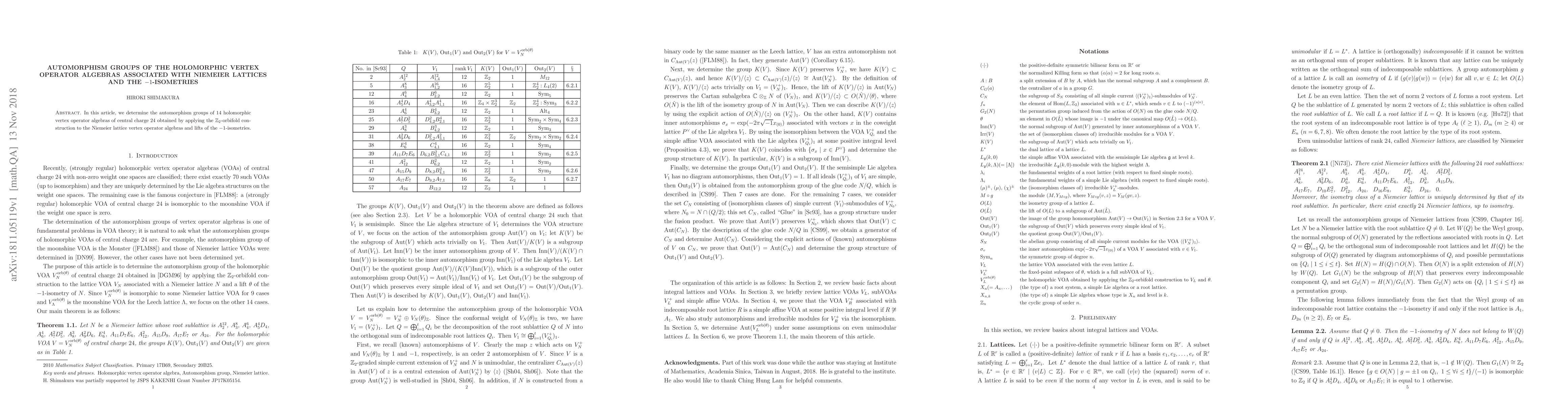 This paper identifies the automorphism groups of 14 holomorphic vertex operator algebras with central charge 24, derived via $\mathbb{Z}_2$-orbifold construction from Niemeier lattices and their $-1$-isometries. The study focuses on structural properties and symmetries inherent in these algebras.