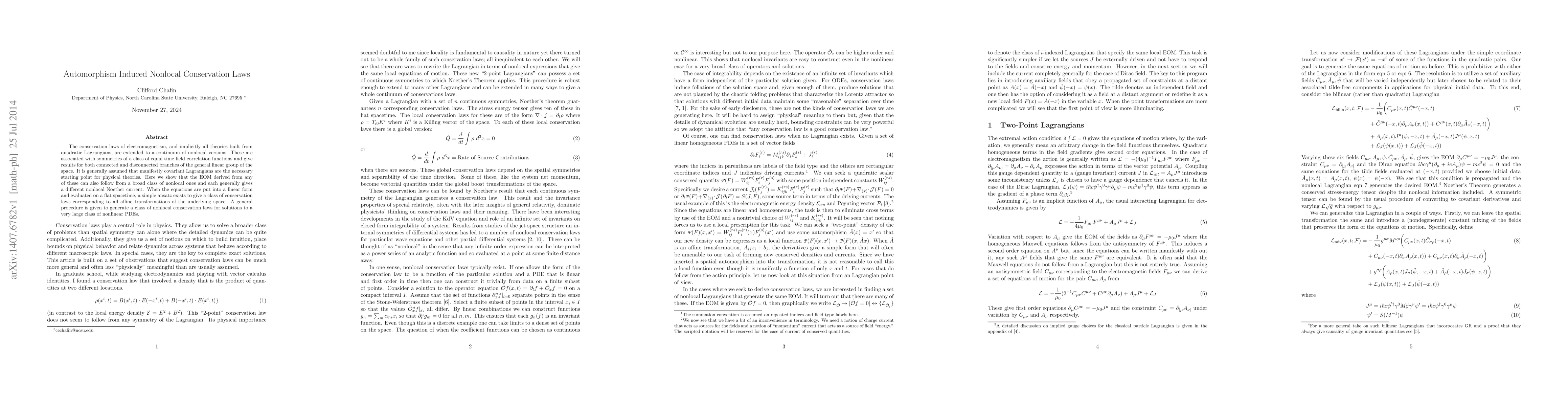 The conservation laws of electromagnetism, and implicitly all theories built from quadratic Lagrangians, are extended to a continuum of nonlocal versions. These are associated with symmetries of a class of equal time field correlation functions and give results for both connected and disconnected branches of the general linear group of the space. It is generally assumed that manifestly covariant Lagrangians are the necessary starting point for physical theories. Here we show that the EOM derived from any of these can also follow from a broad class of nonlocal ones and each generally gives a different nonlocal Noether current. When the equations are put into a linear form and evaluated on a flat spacetime, a simple ansatz exists to give a class of conservation laws corresponding to all affine transformations of the underlying space. A general procedure is given to generate a class of nonlocal conservation laws for solutions to a very large class of nonlinear PDEs.