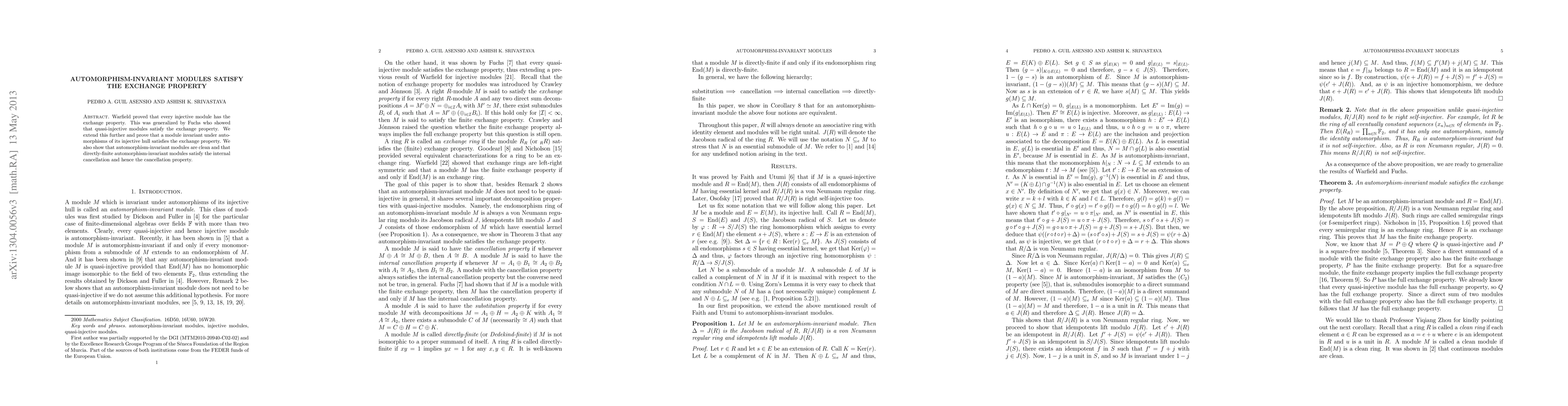 This paper extends the exchange property to automorphism-invariant modules, proving they satisfy the exchange property, are clean, and directly-finite ones fulfill the internal and cancellation properties. The findings build on prior work by Warfield and Fuchs on injective and quasi-injective modules.