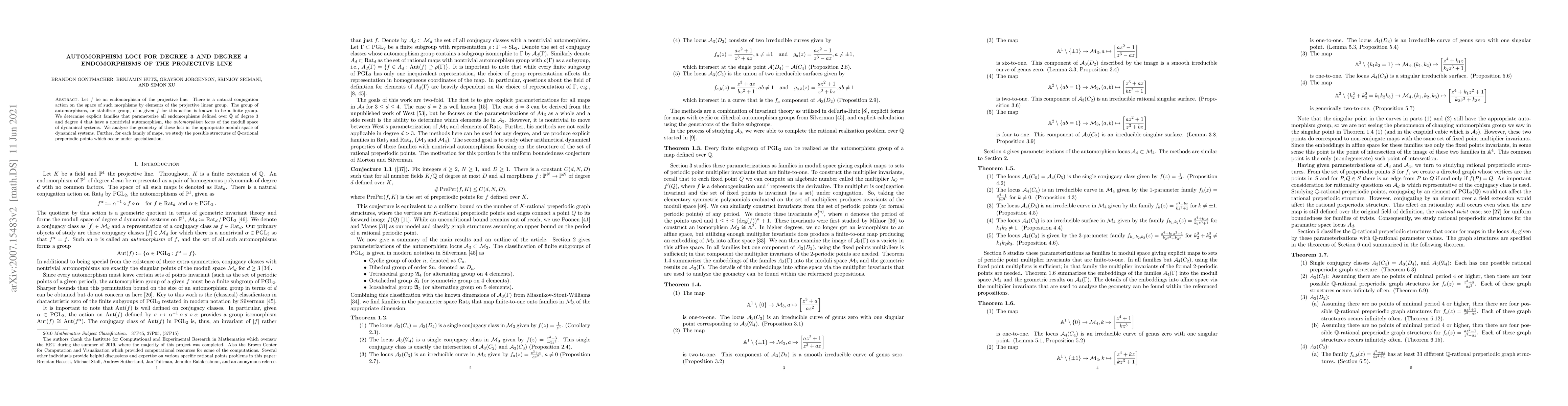 Let $f$ be an endomorphism of the projective line. There is a natural conjugation action on the space of such morphisms by elements of the projective linear group. The group of automorphisms, or stabilizer group, of a given $f$ for this action is known to be a finite group. We determine explicit families that parameterize all endomorphisms defined over $\bar{\mathbb{Q}}$ of degree $3$ and degree $4$ that have a nontrivial automorphism, the \textit{automorphism locus} of the moduli space of dynamical systems. We analyze the geometry of these loci in the appropriate moduli space of dynamical systems. Further, for each family of maps, we study the possible structures of $\mathbb{Q}$-rational preperiodic points which occur under specialization.