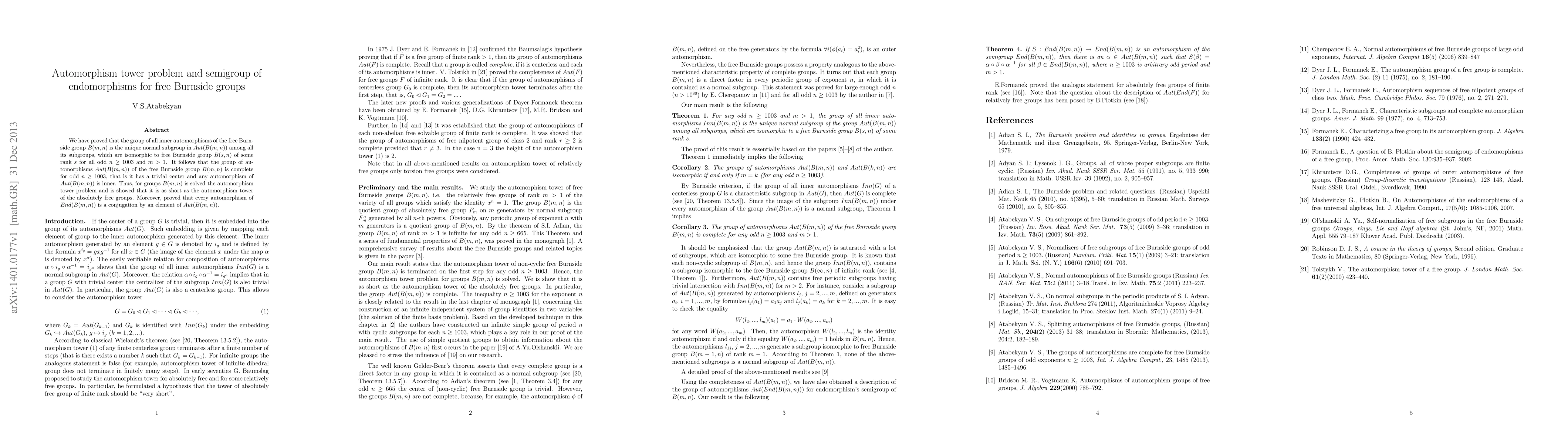 This paper proves that the free Burnside group $B(m,n)$ has a trivial center and every automorphism is inner for odd $n \geq 1003$, solving the automorphism tower problem and showing the semigroup of endomorphisms $End(B(m,n))$ is fully determined by conjugation by elements of $Aut(B(m,n))$.