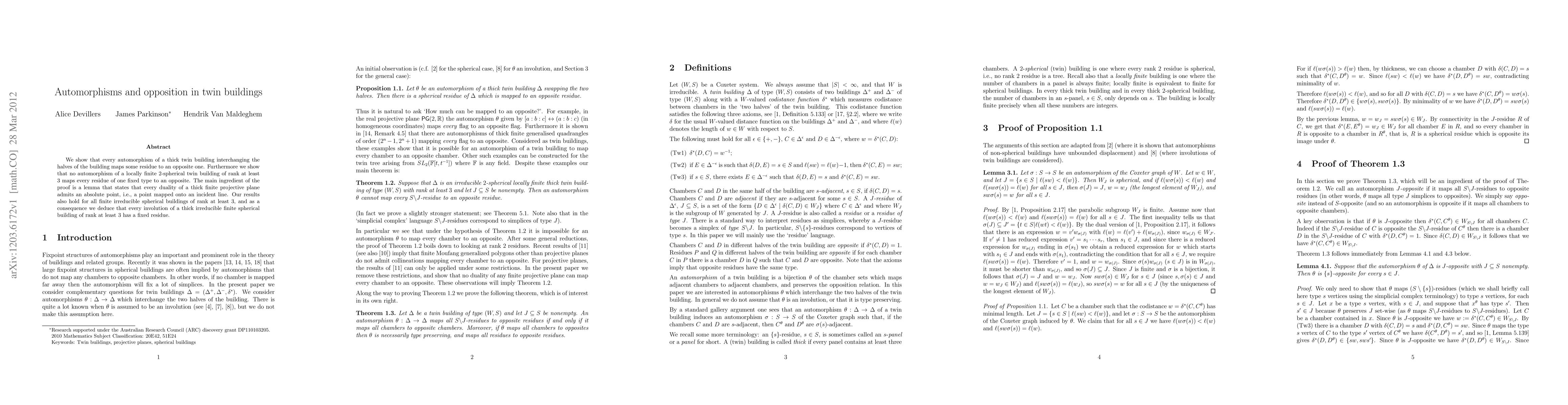 This paper demonstrates that automorphisms of thick twin buildings interchange halves and map residues to opposites, while those of locally finite 2-spherical twin buildings of rank at least 3 do not map every residue of one type to an opposite. The proof relies on a lemma about dualities in thick finite projective planes admitting absolute points.