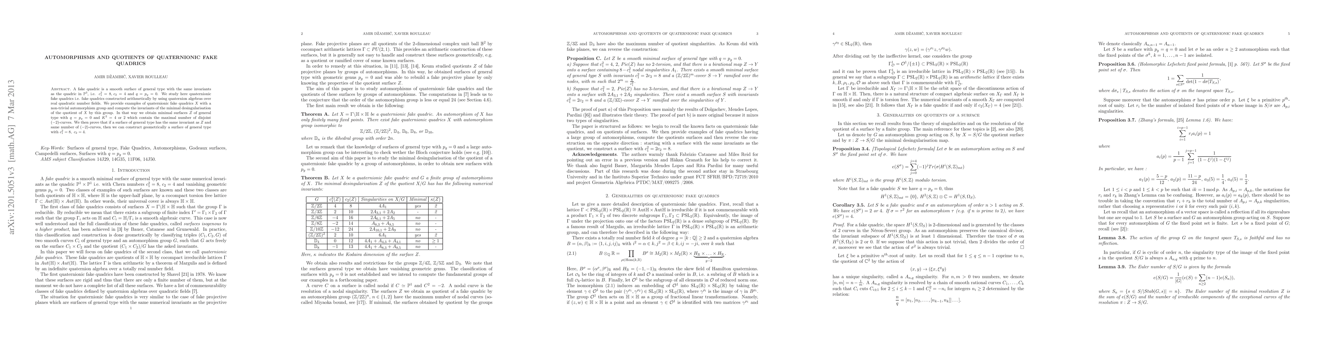This paper explores quaternionic fake quadrics, providing examples with non-trivial automorphism groups and computing invariants of their quotients. It constructs minimal surfaces of general type with specific invariants and nodal curves, demonstrating the construction of a surface with the invariants of a genuine quadric.