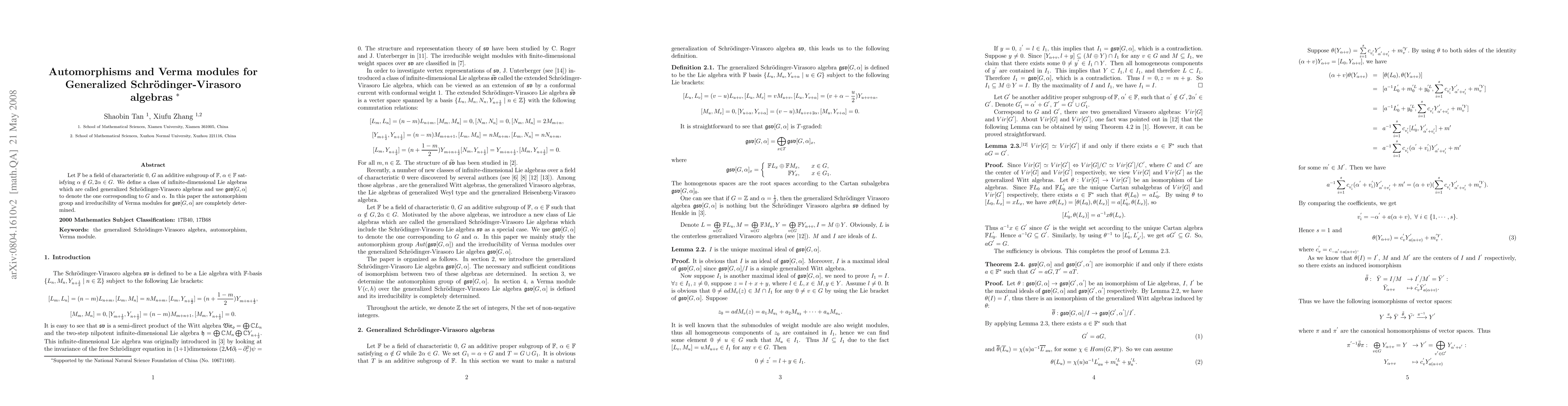 This paper defines generalized Schrödinger-Virasoro algebras $\mathfrak{gsv}[G,\alpha]$ and determines their automorphism group and the irreducibility of Verma modules. The focus is on the structure and properties of these algebras in characteristic 0 fields.