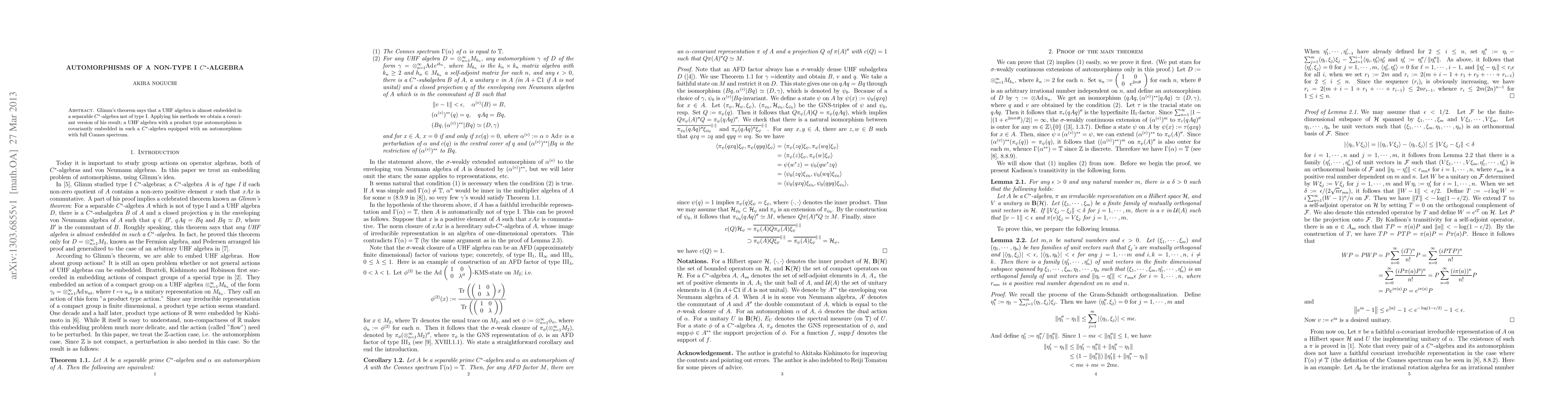 Glimm's theorem says that a UHF algebra is almost embedded in a separable $C^*$-algebra not of type I. Applying his methods we obtain a covariant version of his result; a UHF algebra with a product type automorphism is covariantly embedded in such a $C^*$-algebra equipped with an automorphism with full Connes spectrum.