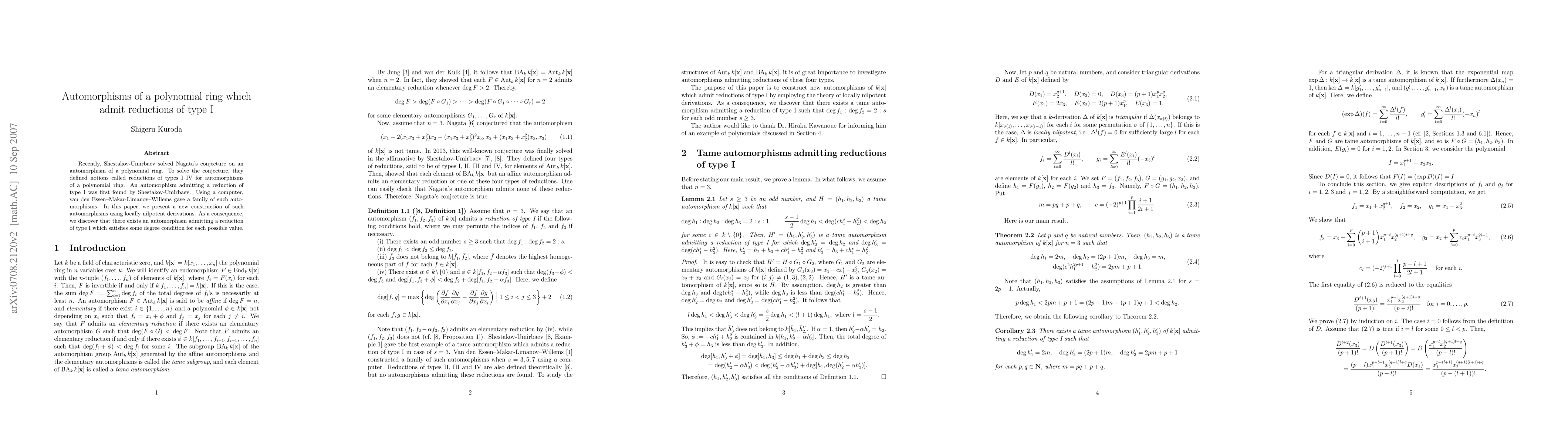 This paper introduces a new method for constructing automorphisms of polynomial rings that admit reductions of type I, leveraging locally nilpotent derivations. It also reveals the existence of such automorphisms satisfying specific degree conditions for each possible value.