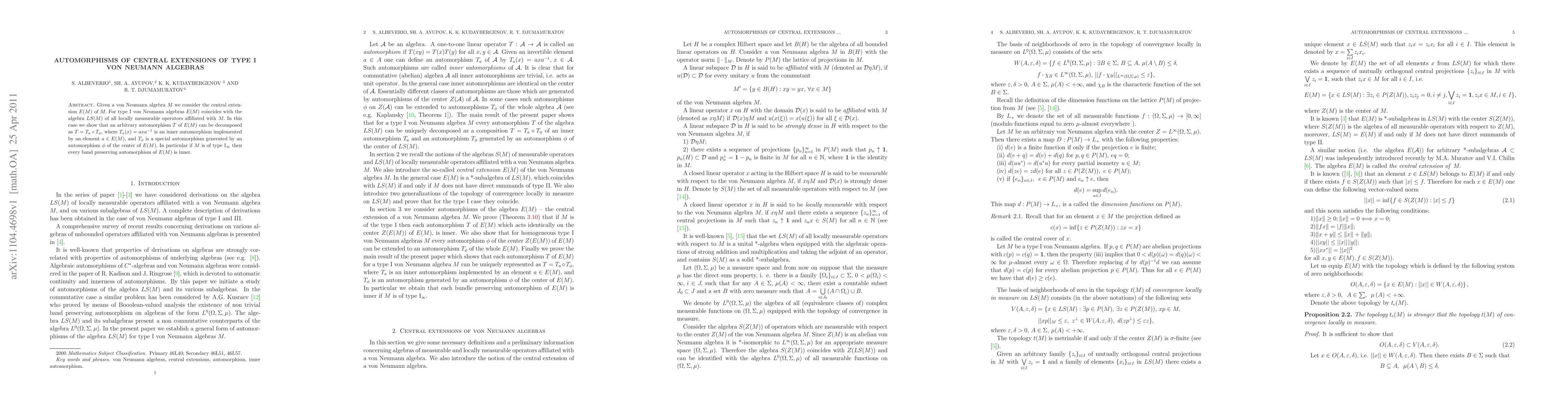 This paper decomposes automorphisms of central extensions of type I von Neumann algebras into inner automorphisms and special automorphisms generated by center automorphisms, showing that for type I$_∞$ algebras, all band preserving automorphisms are inner.