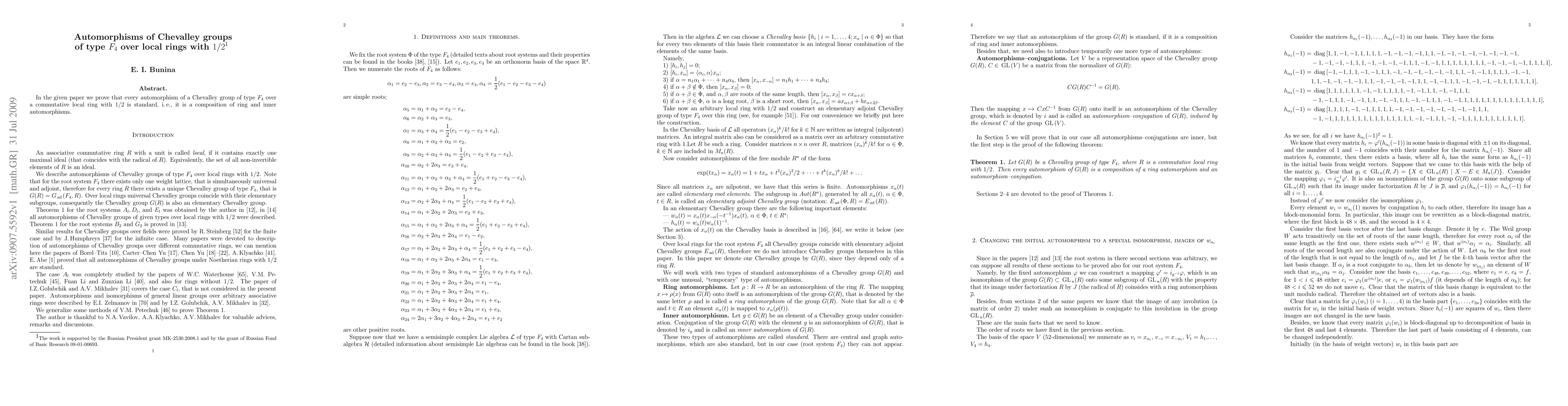 Summary: The paper demonstrates that any automorphism of a Chevalley group of type $F_4$ over a commutative local ring containing 1/2 is standard, consisting of ring and inner automorphisms. This establishes a classification of such automorphisms.