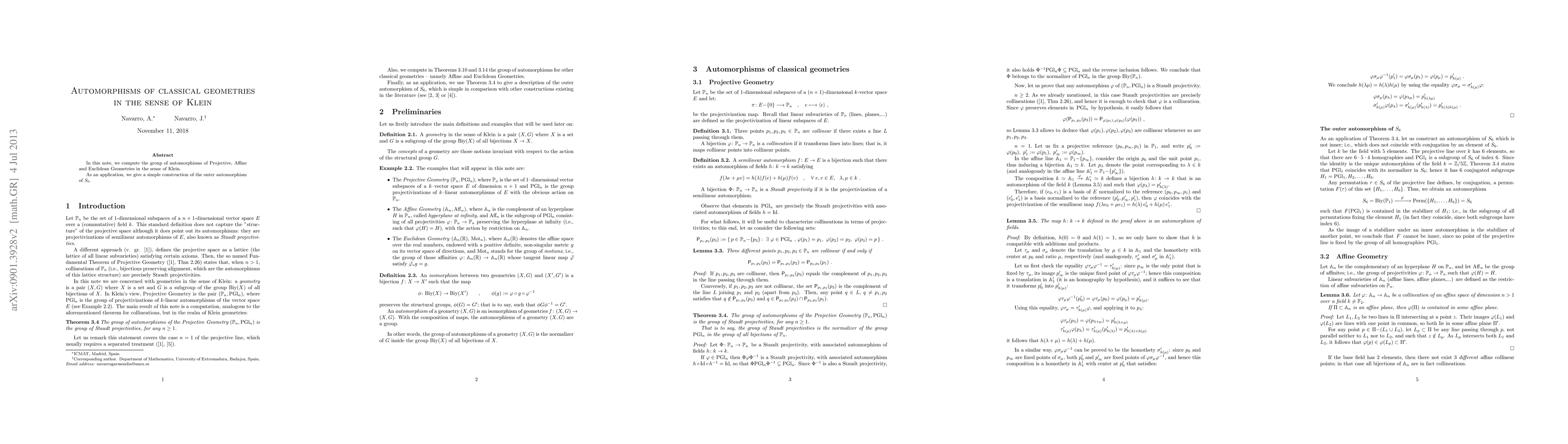 In this note, we compute the group of automorphisms of Projective, Affine and Euclidean Geometries in the sense of Klein. As an application, we give a simple construction of the outer automorphism of S_6.