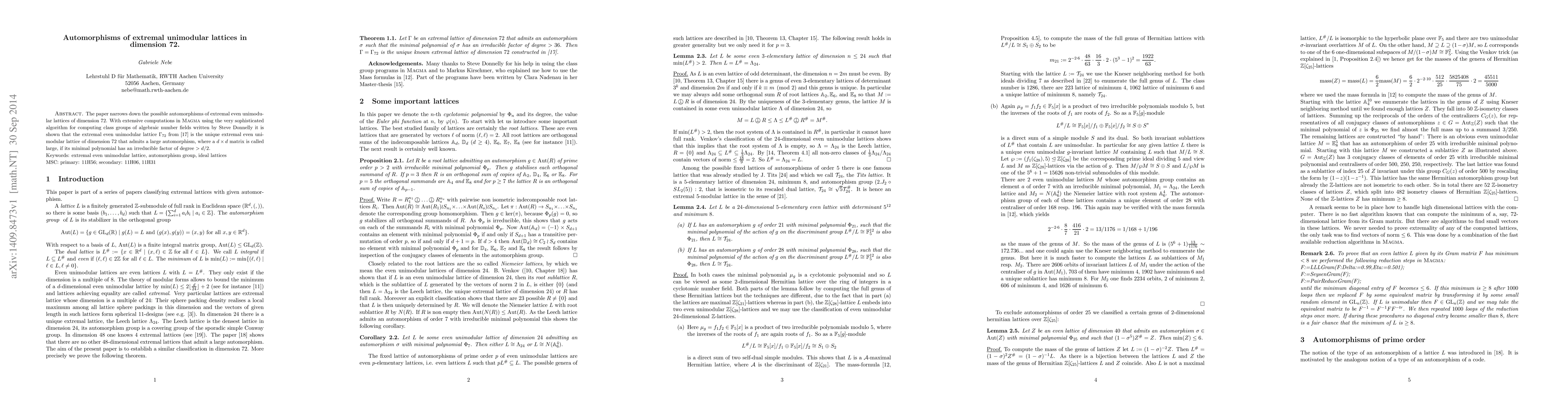 The paper identifies the unique extremal even unimodular lattice of dimension 72 that admits a large automorphism, using advanced computations in Magma and sophisticated algorithms for computing class groups. The result confirms that only the lattice $\Gamma_{72}$ from a referenced source has such automorphisms.