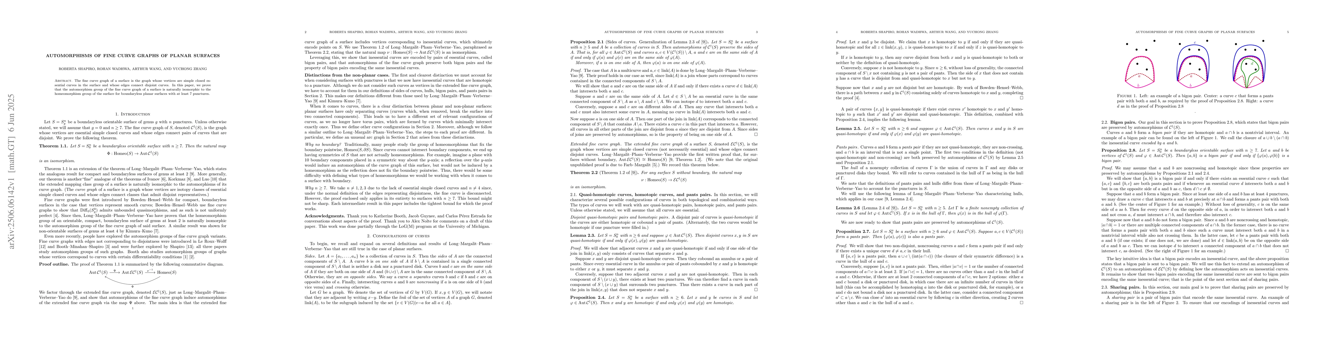 This research establishes that the automorphism group of the fine curve graph for boundaryless planar surfaces with at least 7 punctures mirrors the homeomorphism group of the surface, indicating a deep connection between geometric and group-theoretic properties of these surfaces.