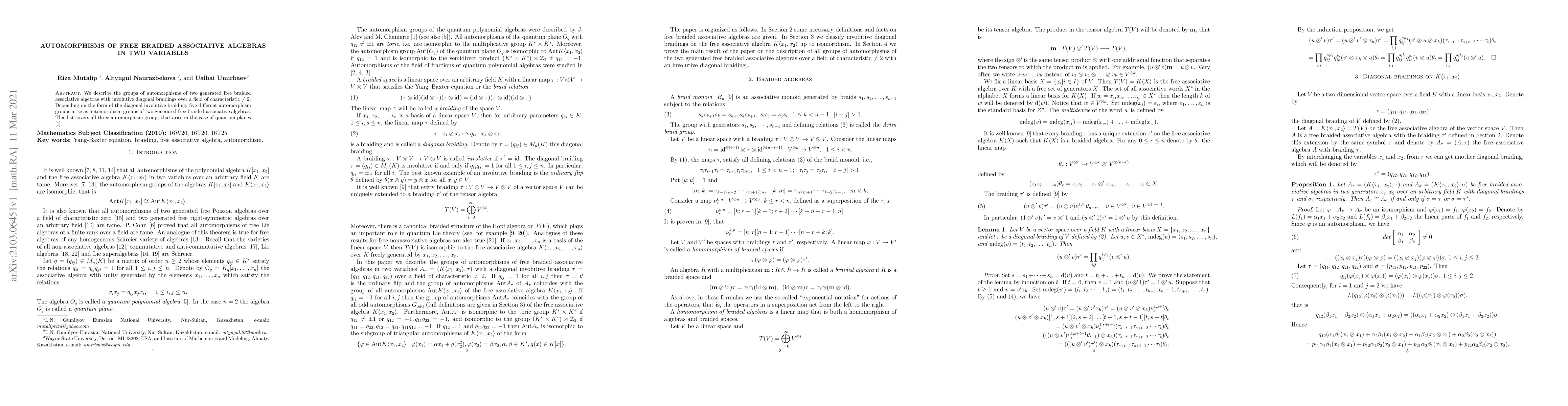 This paper investigates the automorphism groups of two-generated free braided associative algebras with involutive diagonal braidings, identifying five distinct groups depending on the braiding form, and covering the three groups found in quantum planes.
