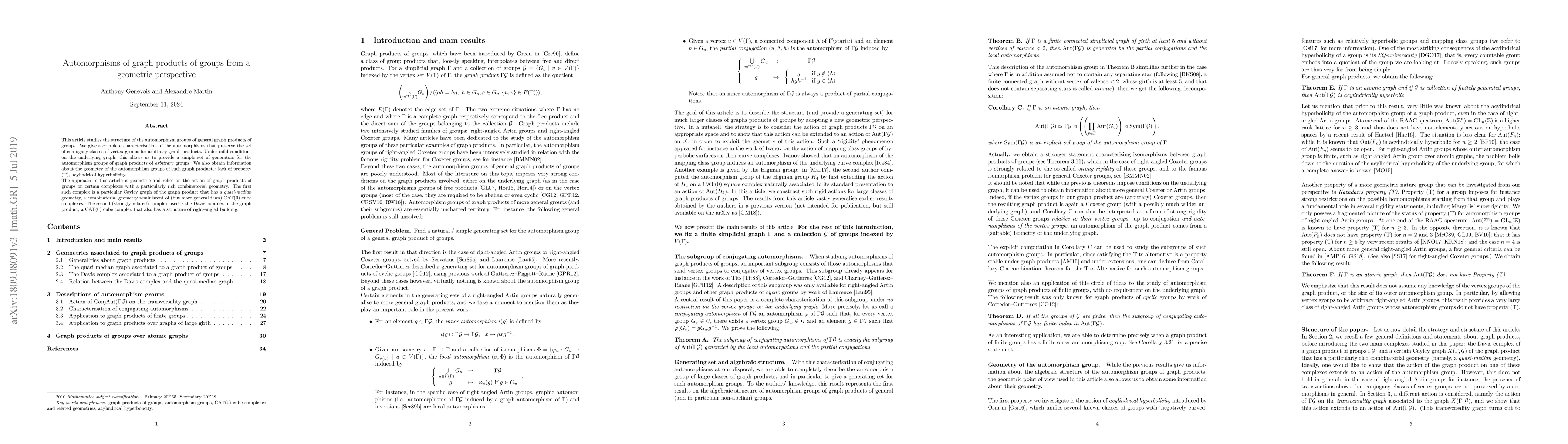 This paper characterizes automorphisms of graph products of groups, showing they decompose into inner automorphisms, partial conjugations, and graph symmetries. It applies these findings to compute the automorphism group for specific graph products and demonstrates their acylindrical hyperbolicity and lack of property (T). The geometric approach uses quasi-median Cayley graphs and Davis complexes.
