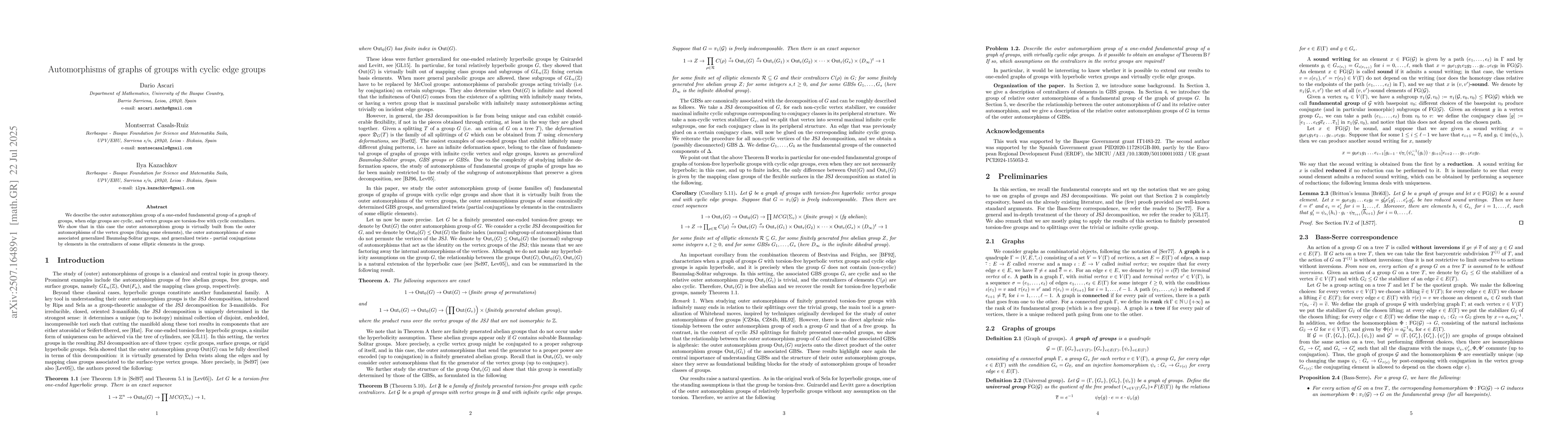 The research describes the outer automorphism group of a one-ended fundamental group of a graph of groups with cyclic edge groups, focusing on torsion-free vertex groups and cyclic centralizers.