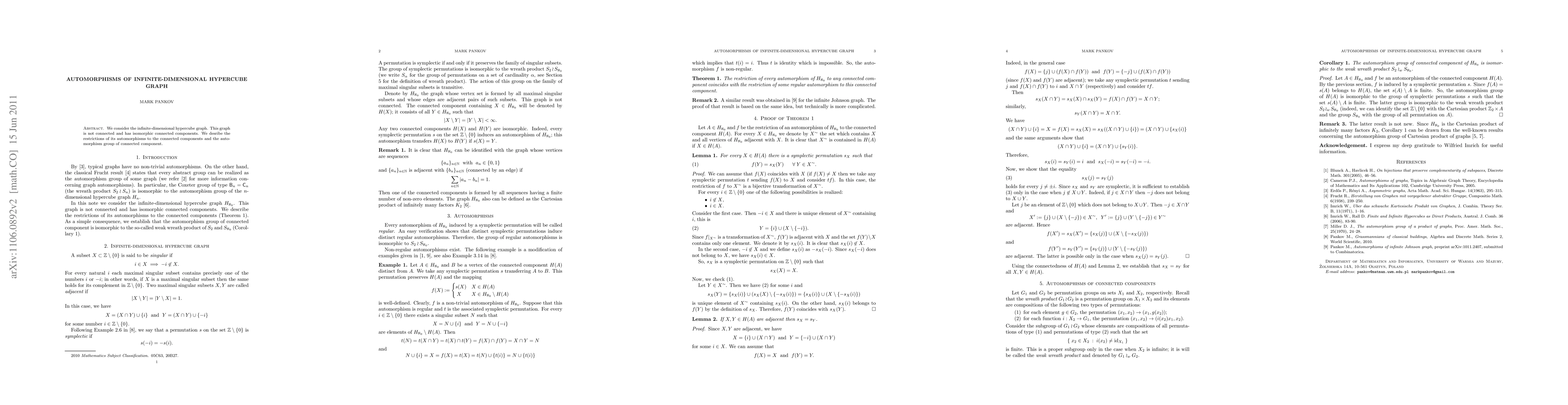 Summary: The paper investigates the automorphisms of the infinite-dimensional hypercube graph, which comprises disconnected but isomorphic connected components, and explores how these automorphisms relate to the automorphisms of individual components.