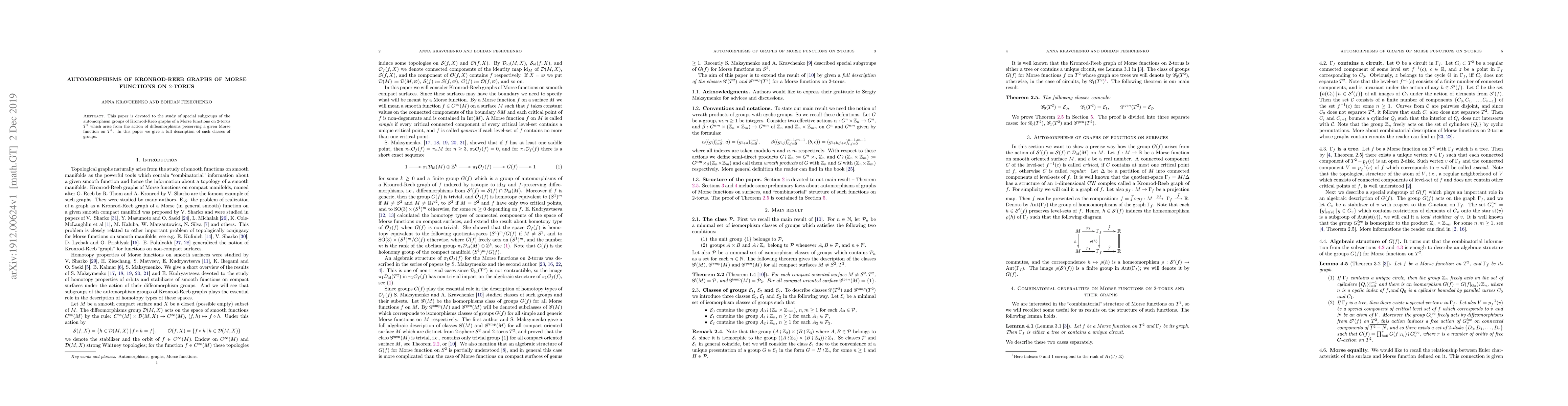This paper is devoted to the study of special subgroups of the automorphism groups of Kronrod-Reeb graphs of a Morse functions on $2$-torus $T^2$ which arise from the action of diffeomorphisms preserving a given Morse function on $T^2$. In this paper we give a full description of such classes of groups.