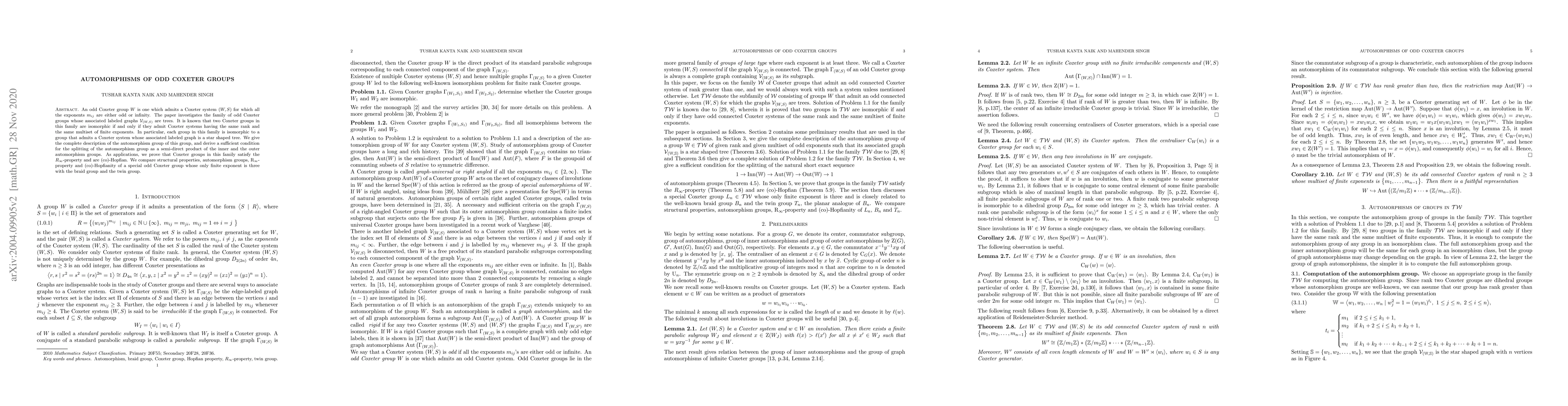An odd Coxeter group $W$ is one which admits a Coxeter system $(W,S)$ for which all the exponents $m_{ij}$ are either odd or infinity. The paper investigates the family of odd Coxeter groups whose associated labeled graphs $\mathcal{V}_{(W,S)}$ are trees. It is known that two Coxeter groups in this family are isomorphic if and only if they admit Coxeter systems having the same rank and the same multiset of finite exponents. In particular, each group in this family is isomorphic to a group that admits a Coxeter system whose associated labeled graph is a star shaped tree. We give the complete description of the automorphism group of this group, and derive a sufficient condition for the splitting of the automorphism group as a semi-direct product of the inner and the outer automorphism groups. As applications, we prove that Coxeter groups in this family satisfy the $R_\infty$-property and are (co)-Hopfian. We compare structural properties, automorphism groups, $\R_\infty$-property and (co)-Hopfianity of a special odd Coxeter group whose only finite exponent is three with the braid group and the twin group.