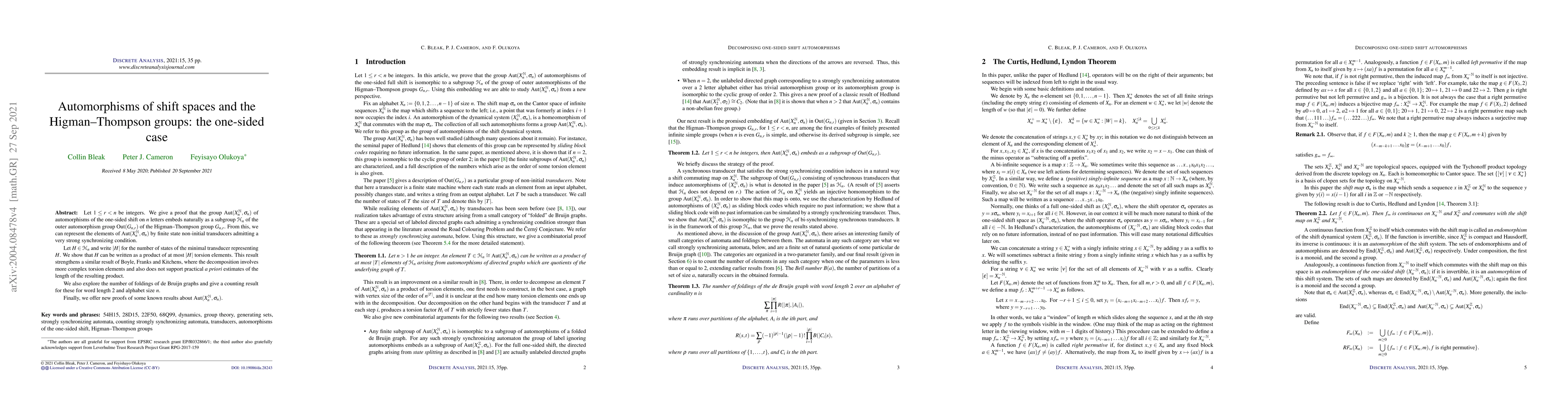 Let $1 \le r < n$ be integers. We give a proof that the group $\mathop{\mathrm{Aut}}({X_{n}^{\mathbb{N}}, \sigma_{n}})$ of automorphisms of the one-sided shift on $n$ letters embeds naturally as a subgroup $\mathcal{H}_{n}$ of the outer automorphism group $\mathop{\mathrm{Out}}({G_{n,r}})$ of the Higman-Thompson group $G_{n,r}$. From this, we can represent the elements of $\mathop{\mathrm{Aut}}({X_{n}^{\mathbb{N}}, \sigma_{n}})$ by finite state non-initial transducers admitting a very strong synchronizing condition. Let $H \in \mathcal{H}_{n}$ and write $|H|$ for the number of states of the minimal transducer representing $H$. We show that $H$ can be written as a product of at most $|H|$ torsion elements. This result strengthens a similar result of Boyle, Franks and Kitchens, where the decomposition involves more complex torsion elements and also does not support practical \textit{a priori} estimates of the length of the resulting product. We also explore the number of foldings of de Bruijn graphs and give a counting result for these for word length $2$ and alphabet size $n$. Finally, we offer new proofs of some known results about $\mathop{\mathrm{Aut}}({X_{n}^{\mathbb{N}}, \sigma_{n}})$.