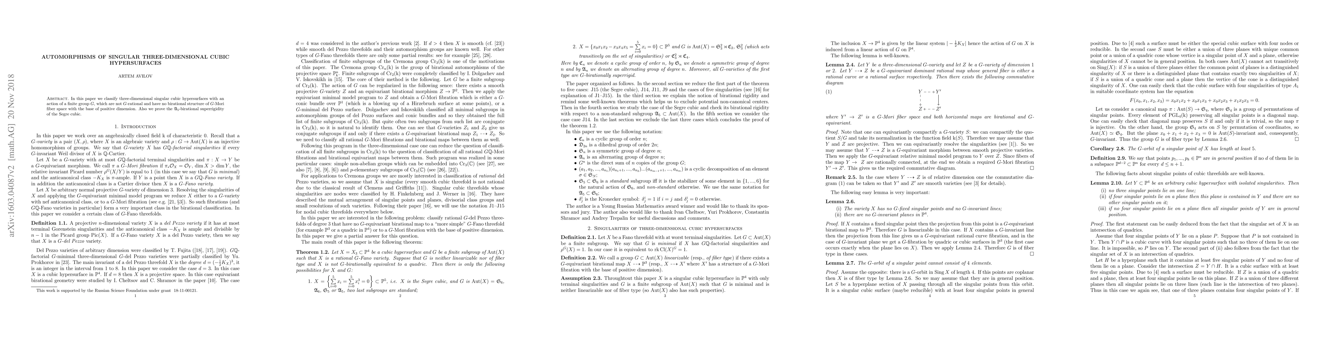 In this paper we classify three-dimensional singular cubic hypersurfaces with an action of a finite group $G$, which are not $G$-rational, are not $G$-birationally isomorphic to a quadric and have no birational structure of $G$-Mori fiber space with the base of positive dimension. Also we prove the $A_{5}$ -birational superrigidity of the Segre cubic.