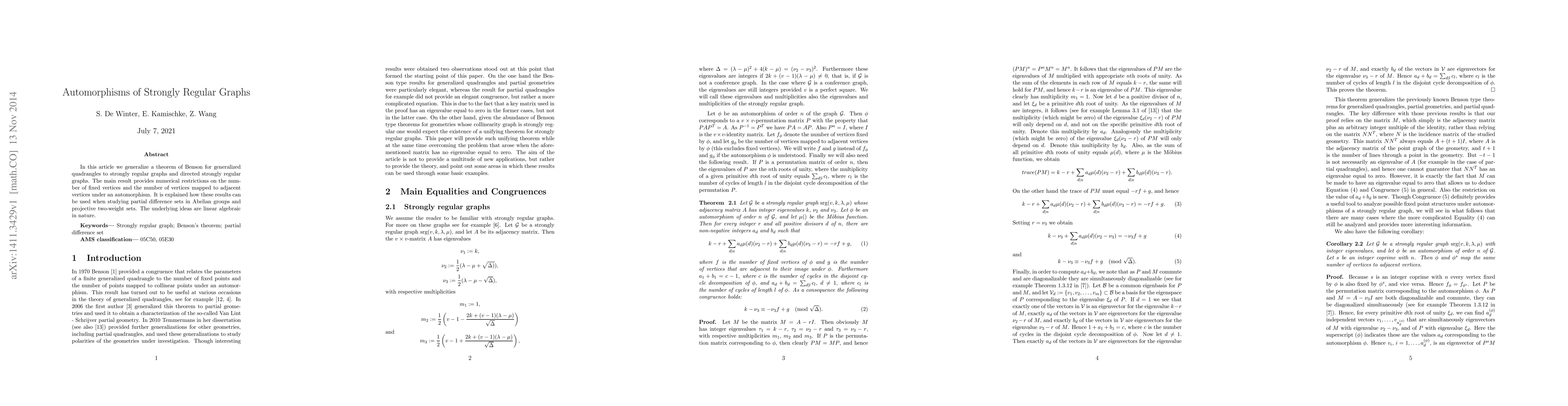 Researchers generalize a theorem to strongly regular graphs and directed strongly regular graphs, establishing numerical restrictions on automorphisms that can help study partial difference sets and projective two-weight sets.