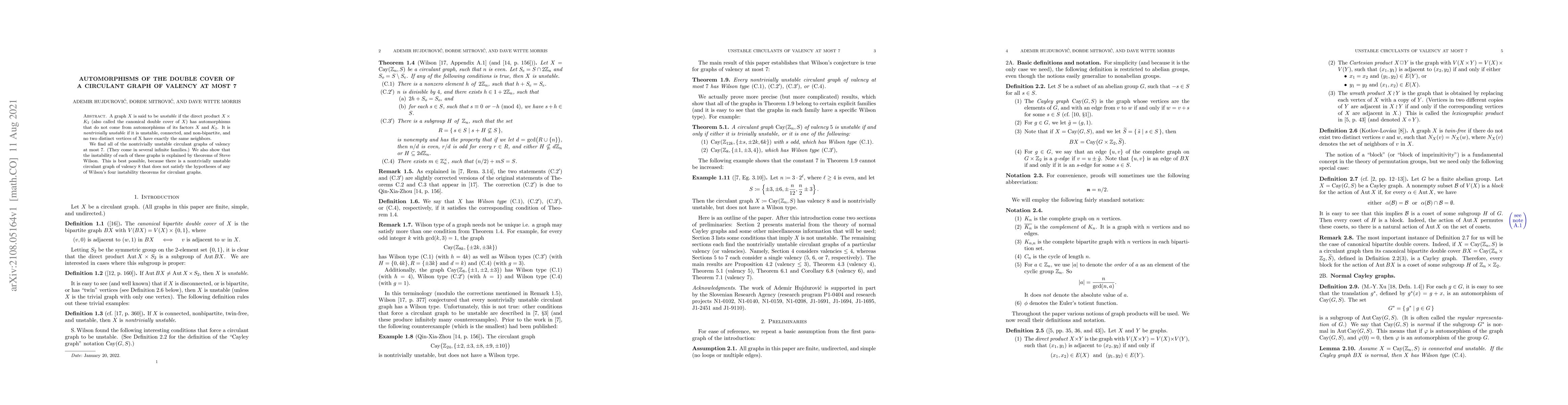 A graph $X$ is said to be unstable if the direct product $X \times K_2$ (also called the canonical double cover of $X$) has automorphisms that do not come from automorphisms of its factors $X$ and $K_2$. It is nontrivially unstable if it is unstable, connected, and non-bipartite, and no two distinct vertices of X have exactly the same neighbors. We find all of the nontrivially unstable circulant graphs of valency at most $7$. (They come in several infinite families.) We also show that the instability of each of these graphs is explained by theorems of Steve Wilson. This is best possible, because there is a nontrivially unstable circulant graph of valency $8$ that does not satisfy the hypotheses of any of Wilson's four instability theorems for circulant graphs.