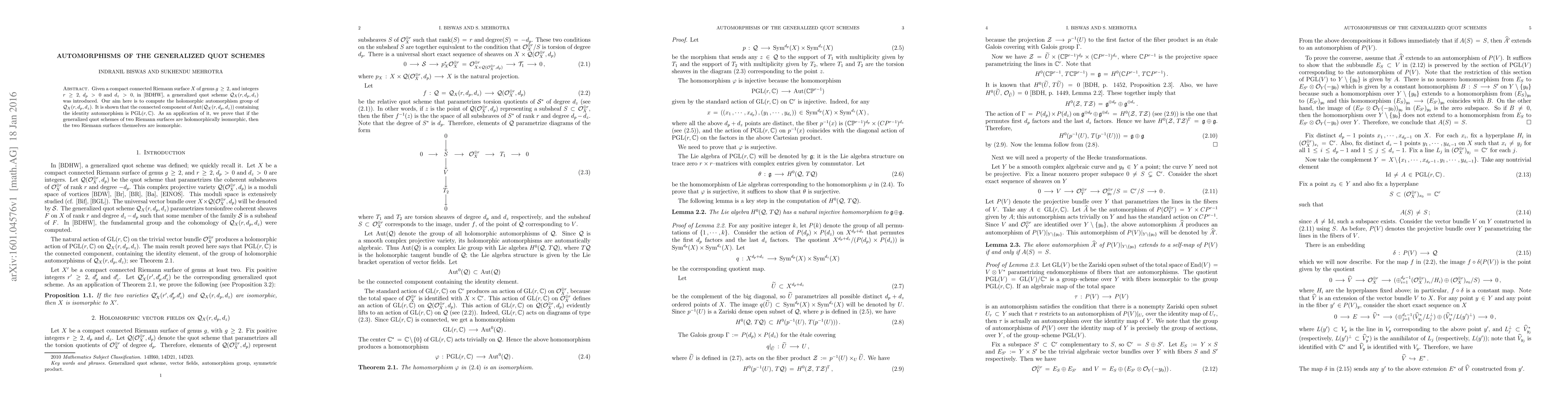 Given a compact connected Riemann surface $X$ of genus $g \geq 2$, and integers $r\geq 2$, $d_p > 0$ and $d_z > 0$, in \cite{BDHW}, a generalized quot scheme ${\mathcal Q}_X(r,d_p,d_z)$ was introduced. Our aim here is to compute the holomorphic automorphism group of ${\mathcal Q}_X(r,d_p,d_z)$. It is shown that the connected component of $\text{Aut}( {\mathcal Q}_X(r,d_p,d_z))$ containing the identity automorphism is $\text{PGL}(r,{\mathbb C})$. As an application of it, we prove that if the generalized quot schemes of two Riemann surfaces are holomorphically isomorphic, then the two Riemann surfaces themselves are isomorphic.