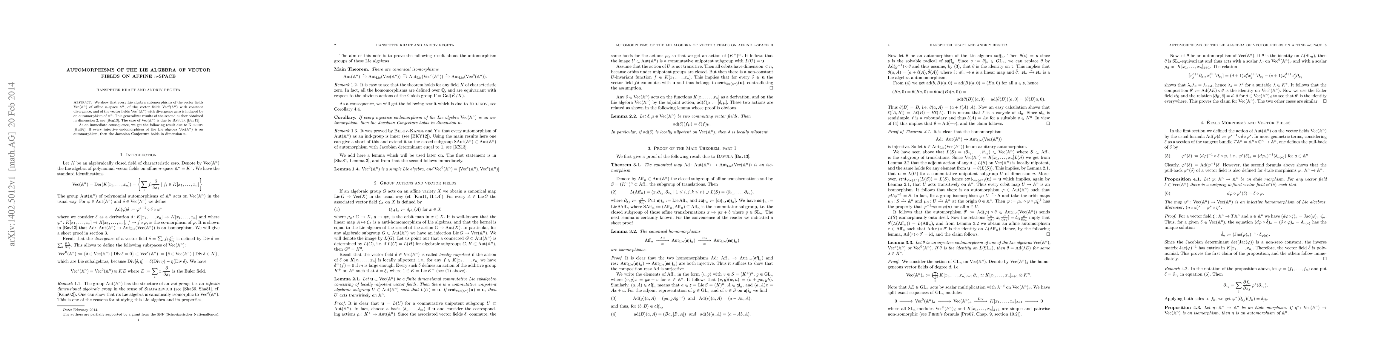 We show that every Lie algebra automorphisms of the vector fields $Vec(A^n)$ of affine n-space $A^n$, of the vector fields $Vec^c(A^n)$ with constant divergence, and of the vector fields $Vec^0(A^n)$ with divergence zero is induced by an automorphism of $A^n$. This generalizes results of the second author obtained in dimension 2. The case of $Vec(A^n)$ is due to Vladimir Bavula. As an immediate consequence, we get the following result which due to Viktor Kulikov. If every injective endomorphism of the simple Lie algebra $Vec(A^n)$ is an automorphism, then the Jacobian Conjecture holds in dimension $n$.