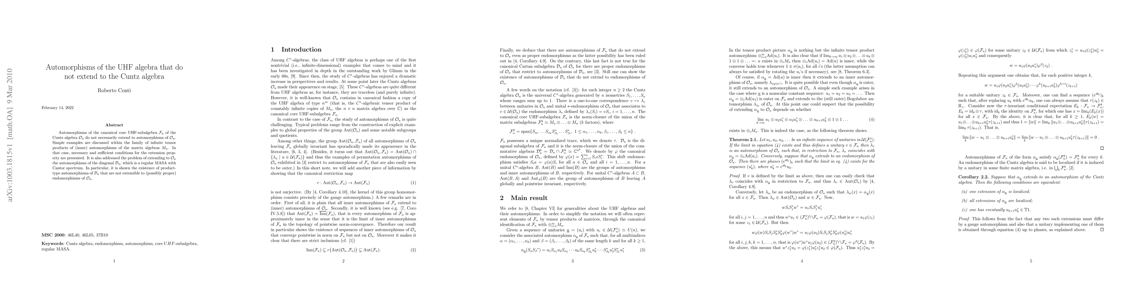 This paper investigates the conditions under which automorphisms of the UHF-subalgebra F_n within the Cuntz algebra O_n extend to O_n. It finds that such extensions are not guaranteed, presenting examples and necessary/sufficient conditions for extension within infinite tensor products of matrix algebras. It also examines automorphisms of the diagonal D_n, showing that certain product-type automorphisms of D_n cannot extend to endomorphisms of O_n.