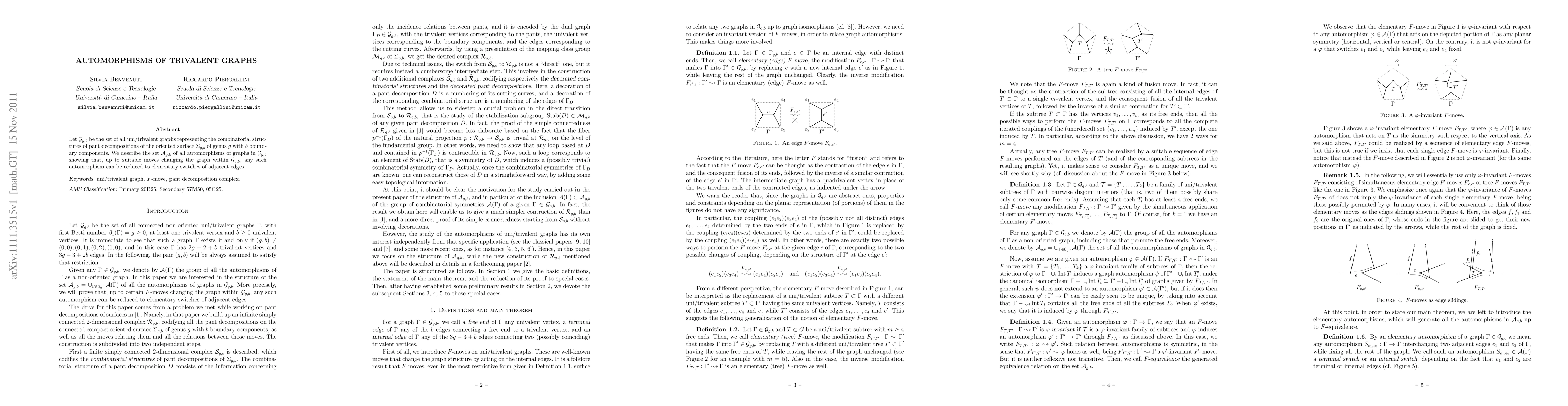 This paper investigates the automorphisms of trivalent graphs representing pant decompositions of oriented surfaces. It demonstrates that any automorphism of such graphs can be simplified to elementary switches of adjacent edges, up to moves within the defined graph set.