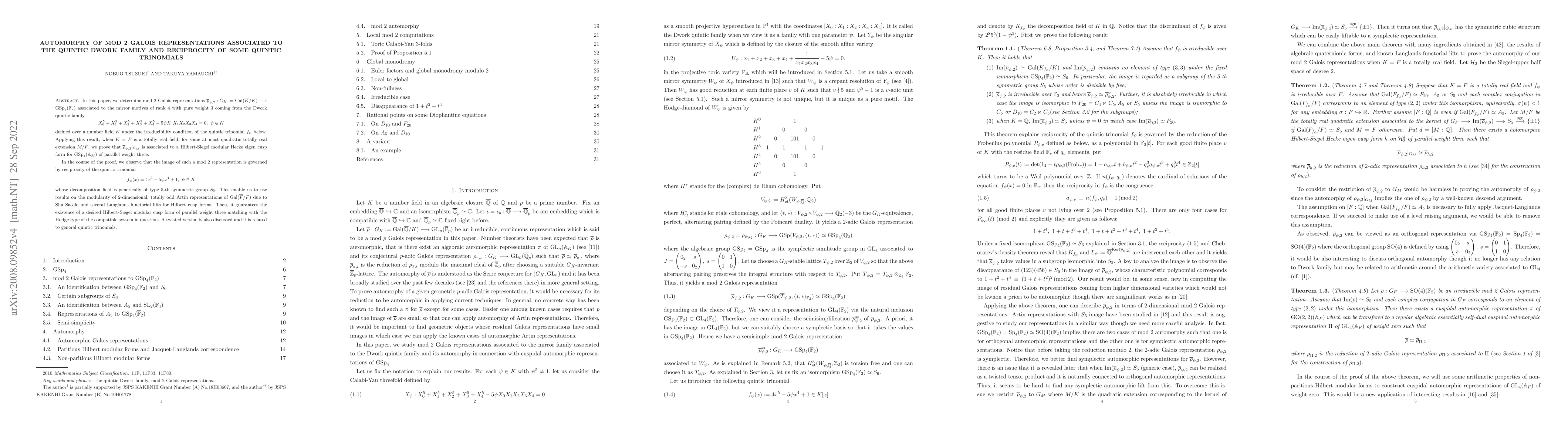 This paper investigates mod 2 Galois representations associated with the Dwork quintic family and proves their automorphy linked to Hilbert-Siegel modular forms. It also explores the reciprocity of specific quintic trinomials, revealing their connection to the image of these Galois representations.