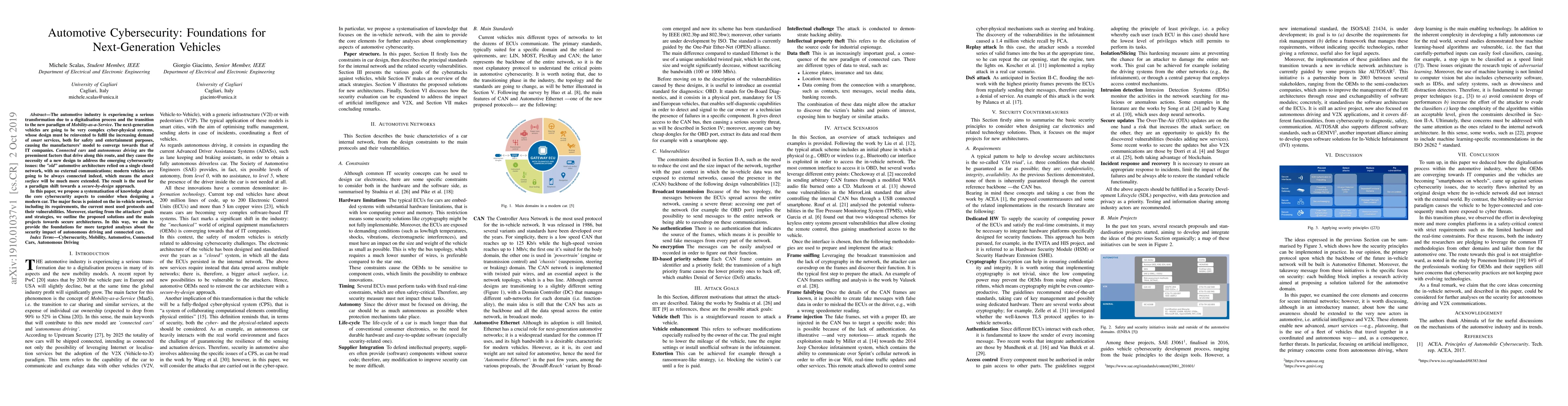 The automotive industry is experiencing a serious transformation due to a digitalisation process and the transition to the new paradigm of Mobility-as-a-Service. The next-generation vehicles are going to be very complex cyber-physical systems, whose design must be reinvented to fulfil the increasing demand of smart services, both for safety and entertainment purposes, causing the manufacturers' model to converge towards that of IT companies. Connected cars and autonomous driving are the preeminent factors that drive along this route, and they cause the necessity of a new design to address the emerging cybersecurity issues: the "old" automotive architecture relied on a single closed network, with no external communications; modern vehicles are going to be always connected indeed, which means the attack surface will be much more extended. The result is the need for a paradigm shift towards a secure-by-design approach.