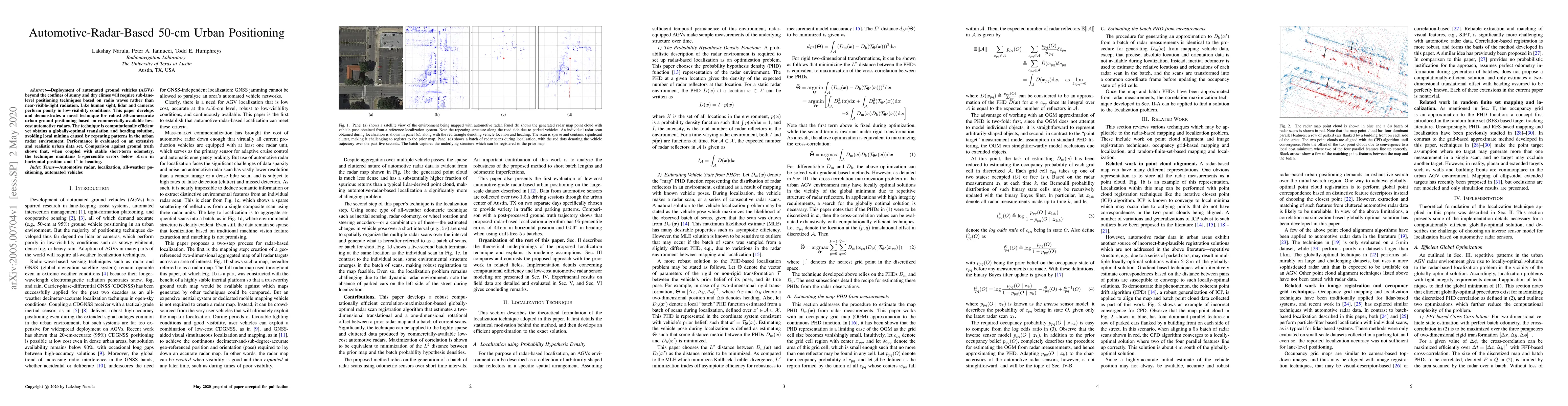 Deployment of automated ground vehicles (AGVs) beyond the confines of sunny and dry climes will require sub-lane-level positioning techniques based on radio waves rather than near-visible-light radiation. Like human sight, lidar and cameras perform poorly in low-visibility conditions. This paper develops and demonstrates a novel technique for robust 50-cm-accurate urban ground positioning based on commercially-available low-cost automotive radars. The technique is computationally efficient yet obtains a globally-optimal translation and heading solution, avoiding local minima caused by repeating patterns in the urban radar environment. Performance is evaluated on an extensive and realistic urban data set. Comparison against ground truth shows that, when coupled with stable short-term odometry, the technique maintains 95-percentile errors below 50 cm in horizontal position and 1 degree in heading.