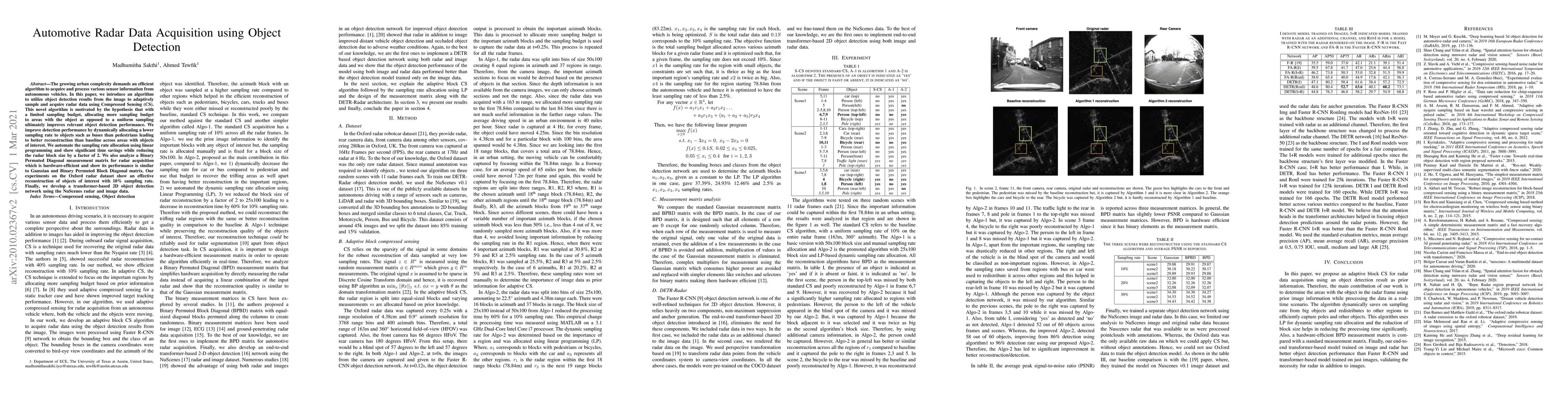 The growing urban complexity demands an efficient algorithm to acquire and process various sensor information from autonomous vehicles. In this paper, we introduce an algorithm to utilize object detection results from the image to adaptively sample and acquire radar data using Compressed Sensing (CS). This novel algorithm is motivated by the hypothesis that with a limited sampling budget, allocating more sampling budget to areas with the object as opposed to a uniform sampling ultimately improves relevant object detection performance. We improve detection performance by dynamically allocating a lower sampling rate to objects such as buses than pedestrians leading to better reconstruction than baseline across areas with objects of interest. We automate the sampling rate allocation using linear programming and show significant time savings while reducing the radar block size by a factor of 2. We also analyze a Binary Permuted Diagonal measurement matrix for radar acquisition which is hardware-efficient and show its performance is similar to Gaussian and Binary Permuted Block Diagonal matrix. Our experiments on the Oxford radar dataset show an effective reconstruction of objects of interest with 10% sampling rate. Finally, we develop a transformer-based 2D object detection network using the NuScenes radar and image data.