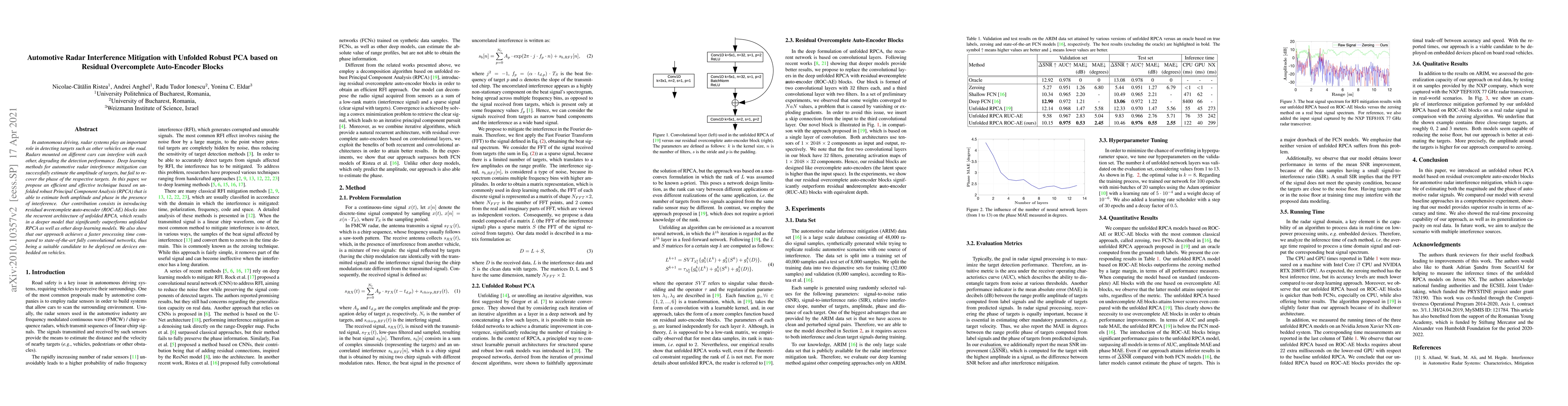 This paper proposes an advanced deep learning technique using unfolded robust PCA with residual overcomplete auto-encoder blocks to mitigate radar interference in autonomous driving. The method effectively estimates both amplitude and phase of targets, outperforming traditional unfolded RPCA and other deep learning models.