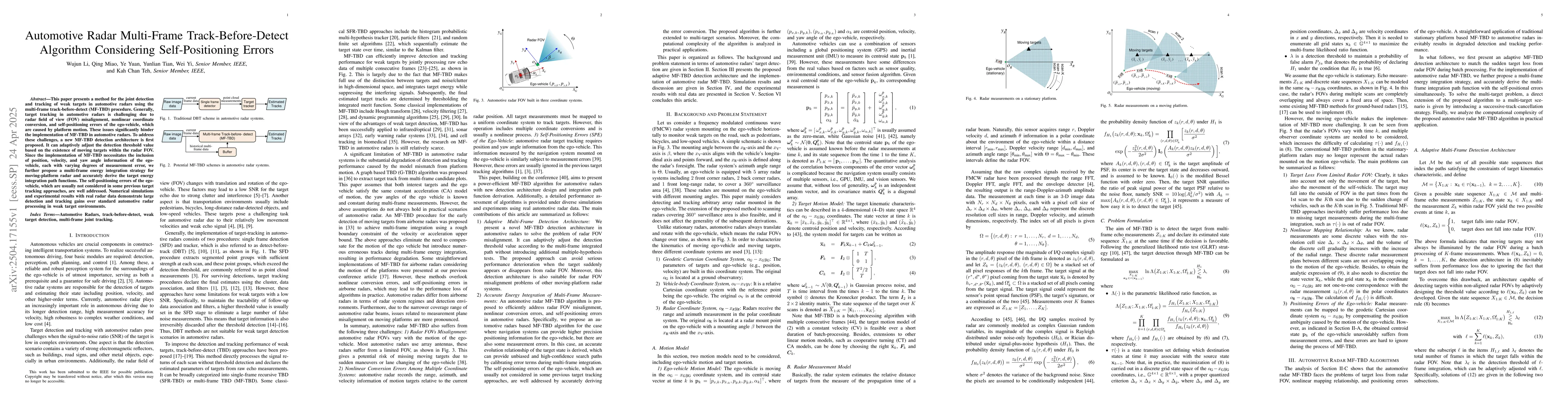 The paper introduces an adaptive MF-TBD detection architecture and a multi-frame energy integration strategy for moving-platform radar, effectively addressing self-positioning errors of the ego-vehicle.