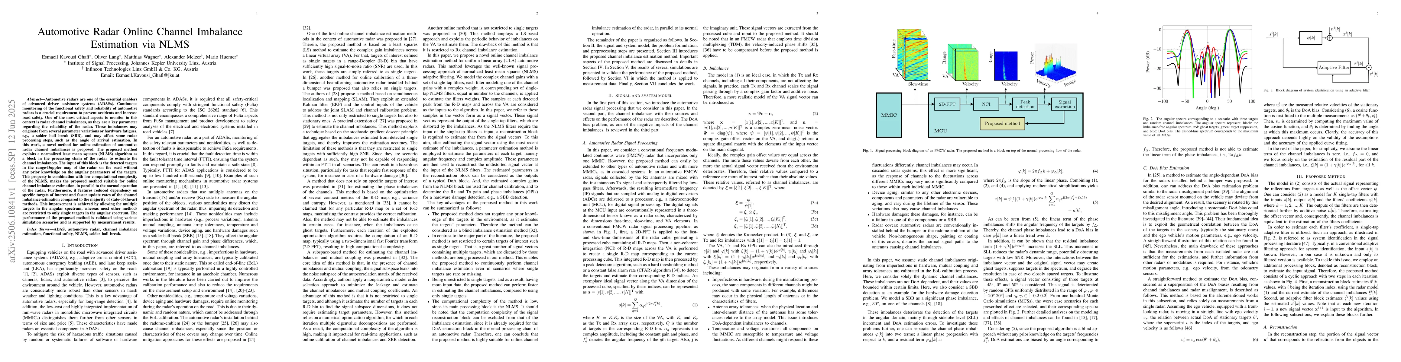 A novel method for estimating automotive radar channel imbalances is proposed using a normalized least mean squares algorithm, offering improved performance and lower computational complexity compared to existing methods.