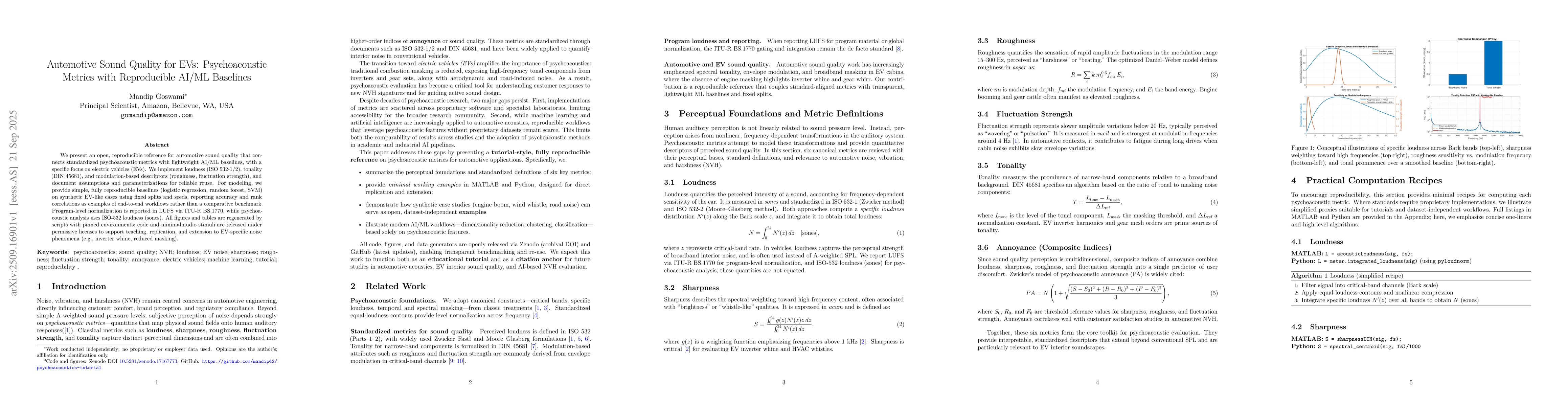 We present an open, reproducible reference for automotive sound quality that connects standardized psychoacoustic metrics with lightweight AI/ML baselines, with a specific focus on electric vehicles (EVs). We implement loudness (ISO 532-1/2), tonality (DIN 45681), and modulation-based descriptors (roughness, fluctuation strength), and document assumptions and parameterizations for reliable reuse. For modeling, we provide simple, fully reproducible baselines (logistic regression, random forest, SVM) on synthetic EV-like cases using fixed splits and seeds, reporting accuracy and rank correlations as examples of end-to-end workflows rather than a comparative benchmark. Program-level normalization is reported in LUFS via ITU-R BS.1770, while psychoacoustic analysis uses ISO-532 loudness (sones). All figures and tables are regenerated by scripts with pinned environments; code and minimal audio stimuli are released under permissive licenses to support teaching, replication, and extension to EV-specific noise phenomena (e.g., inverter whine, reduced masking).