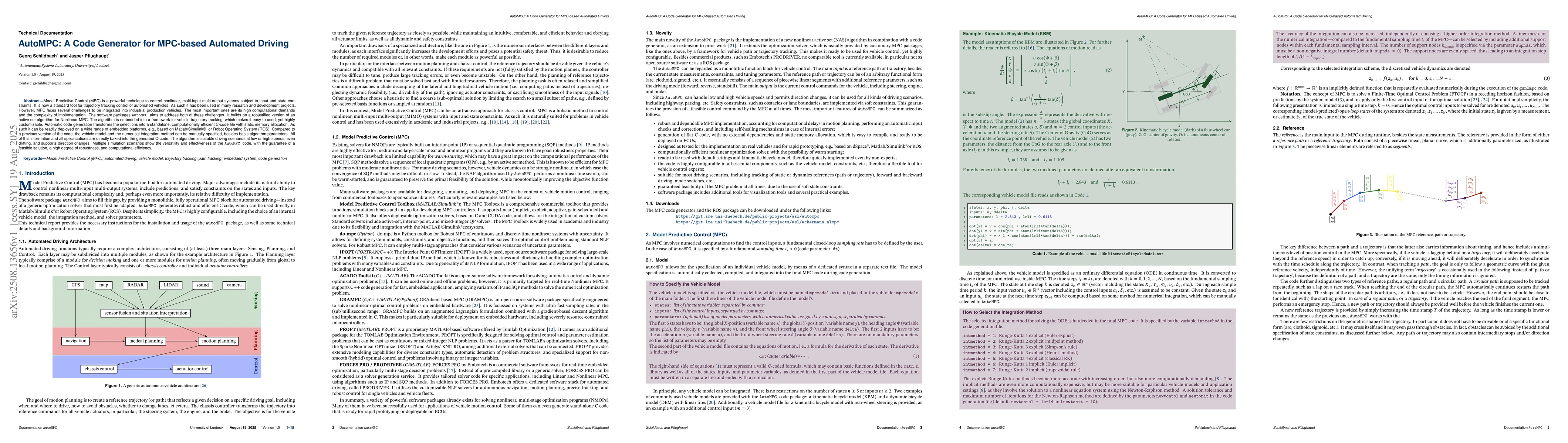 Model Predictive Control (MPC) is a powerful technique to control nonlinear, multi-input multi-output systems subject to input and state constraints. It is now a standard tool for trajectory tracking control of automated vehicles. As such it has been used in many research and development projects. However, MPC faces several challenges to be integrated into industrial production vehicles. The most important ones are its high computational demands and the complexity of implementation. The software packages AutoMPC aims to address both of these challenges. It builds on a robustified version of an active set algorithm for Nonlinear MPC. The algorithm is embedded into a framework for vehicle trajectory tracking, which makes it easy to used, yet highly customizable. Automatic code generation transforms the selections into a standalone, computationally efficient C-code file with static memory allocation. As such it can be readily deployed on a wide range of embedded platforms, e.g., based on Matlab/Simulink or Robot Operating System (ROS). Compared to a previous version of the code, the vehicle model and the numerical integration method can be manually specified, besides basic algorithm parameters. All of this information and all specifications are directly baked into the generated C-code. The algorithm is suitable driving scenarios at low or high speeds, even drifting, and supports direction changes. Multiple simulation scenarios show the versatility and effectiveness of the AutoMPC code, with the guarantee of a feasible solution, a high degree of robustness, and computational efficiency.